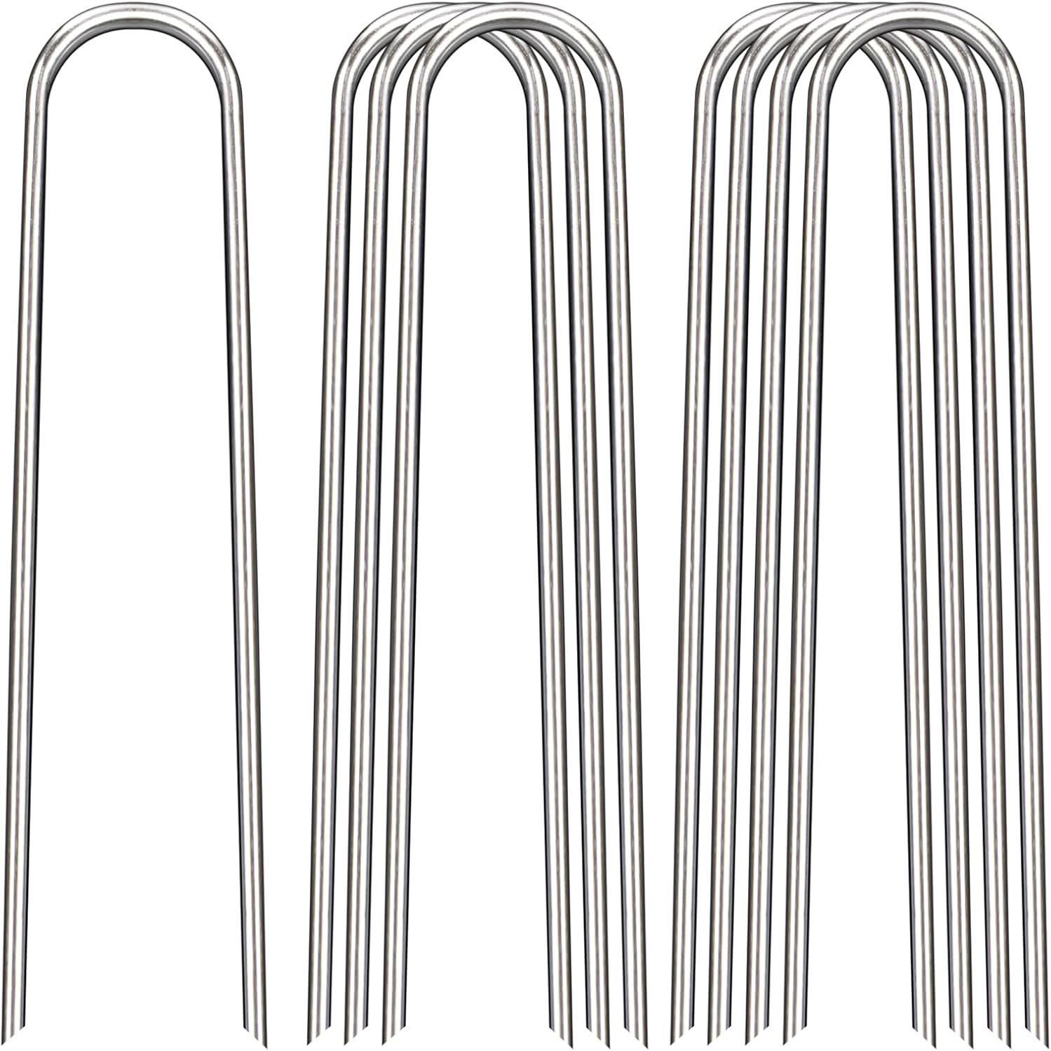- Multi-purpose Metal Stakes: U-shaped tent stakes are ideal for fixing landscape fabrics, lawns, fences, weed barriers, tents, tarps, hoses, etc. They can also be used for Christmas decorations and Halloween light stakes