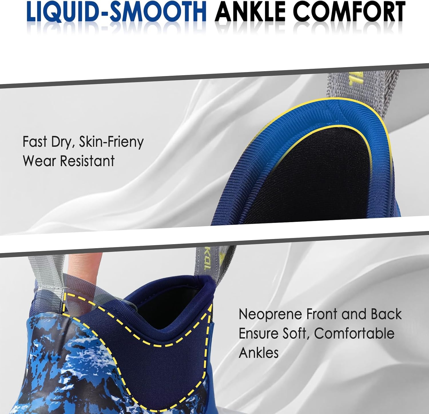 - ๐๐Thoughtful Boots Opening Design: The opening of deck boots features quick-drying, wear-resistant fabric edging that is skin-friendly, the pure neoprene at the front and back ensures soft, comfortable ankles while squatting or walking. Reflective webbing adds safety