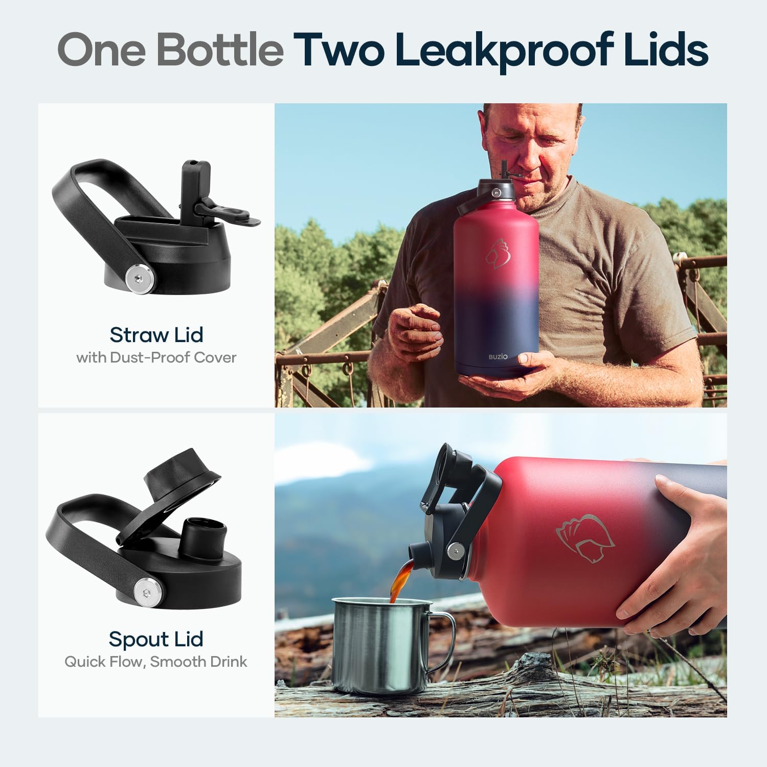128oz Insulated Water Bottle, BUZIO Gallon Water Jug with Straw Lid and Carrying Sleeve (Cold for 48 Hrs) Stainless Steel Hydro Metal Canteen Water Flask, Ruby Red Navy