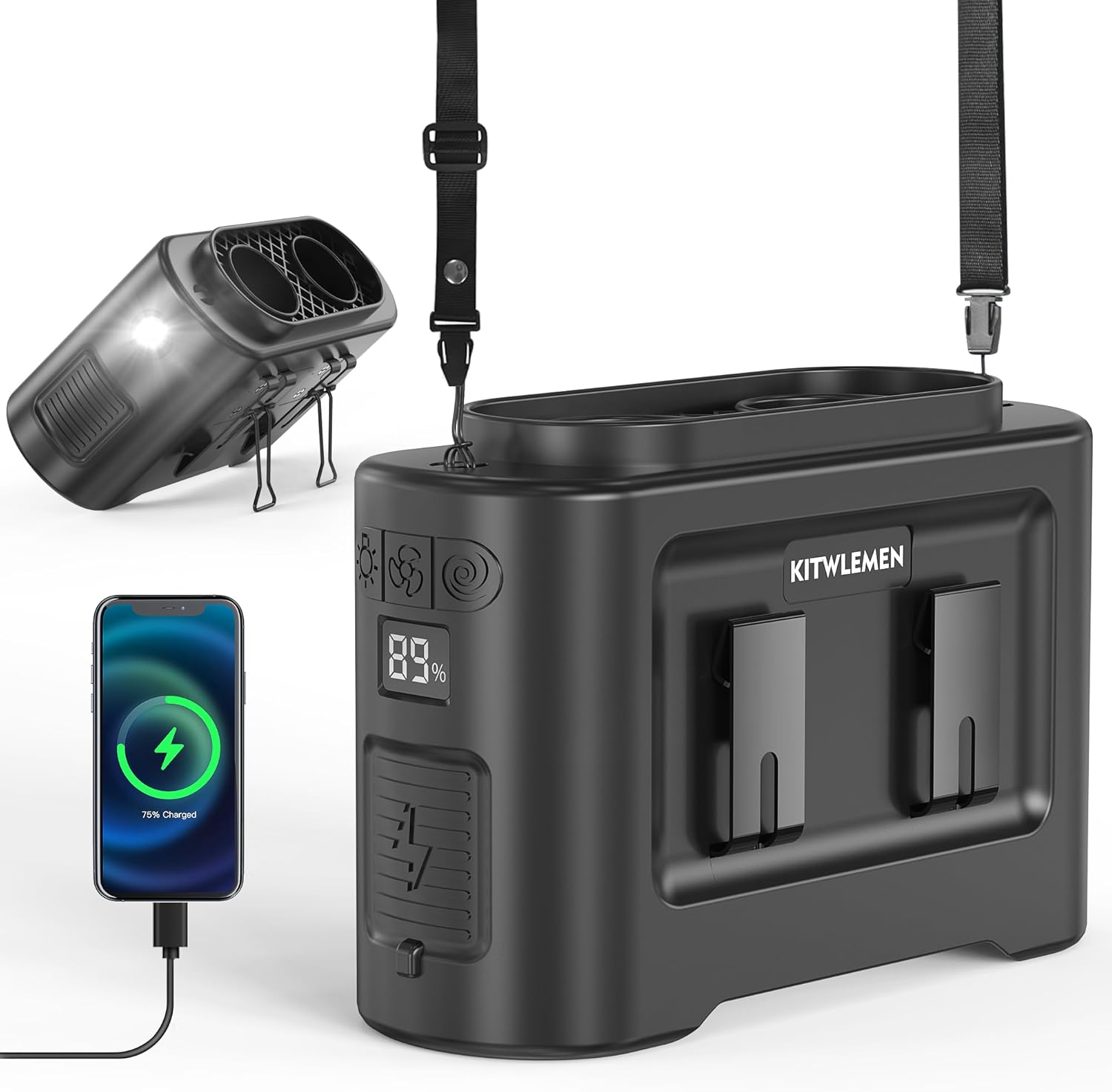 KITWLEMEN 14500mAh Portable Waist Fan - Personal Clip on Belt Fan, Dual Air Outlet, 5 Speed 35H Cooling, Rechargeable Battery Operated, Wearable with Lanyard & Light for Camping, Travel, Jobsite