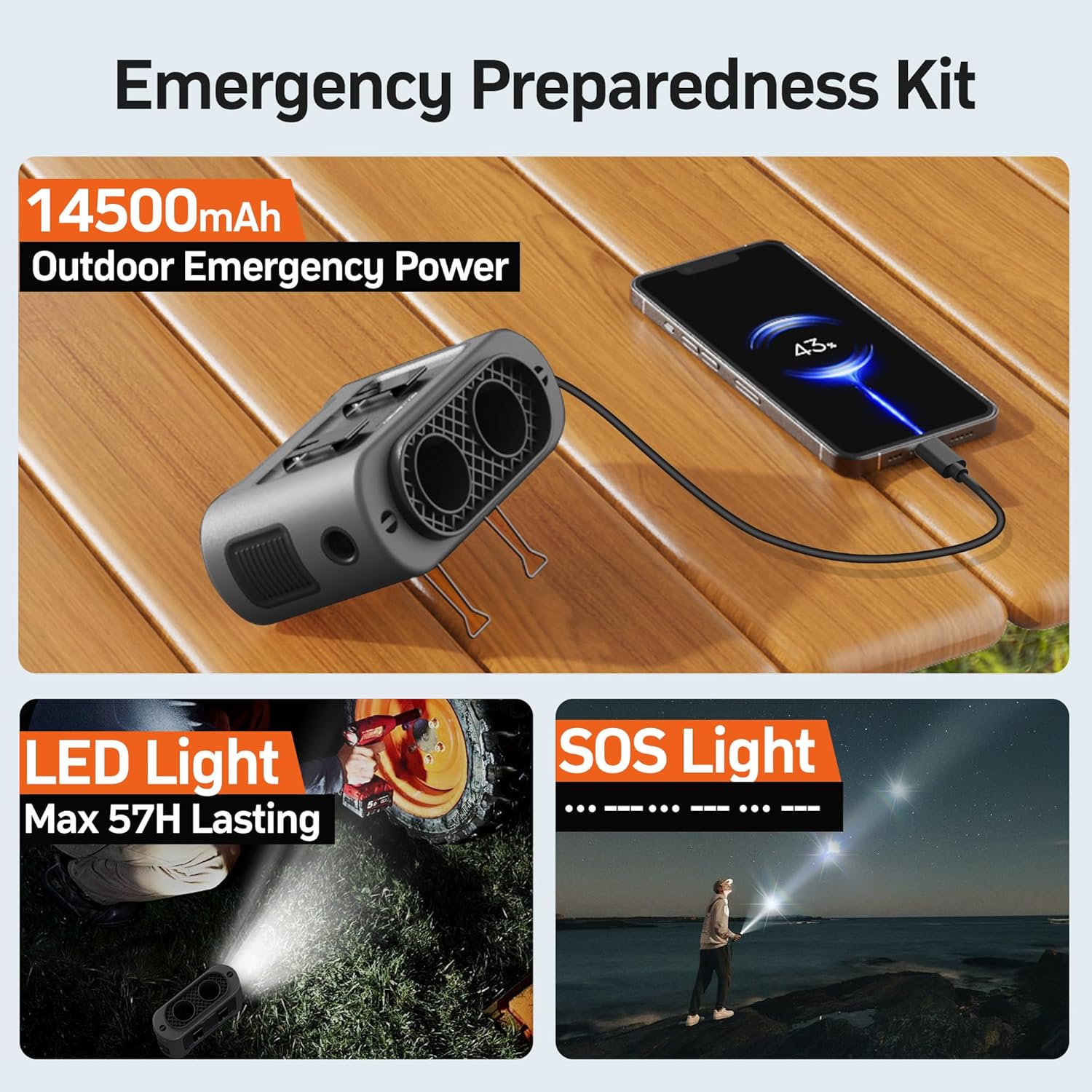- Emergency Tool: This battery operated fan features 2 lighting modes, with a continuous 57-hour lighting mode and a flashing SOS mode. It also has a USB-A output to charge your phone, making it a must-have for nighttime camping, outdoor exploration, or emergencies