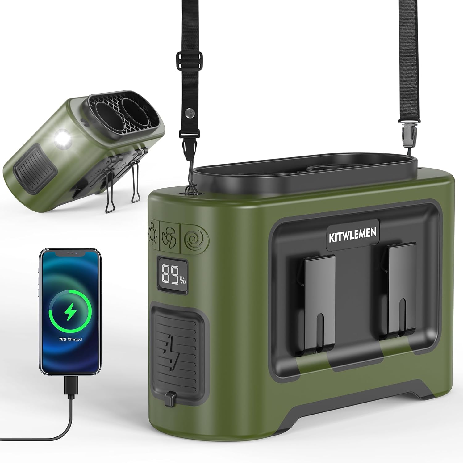 KITWLEMEN 14500mAh Portable Waist Fan - Personal Clip on Belt Fan, Dual Air Outlet, 5 Speed 35H Cooling, Rechargeable Battery Operated, Wearable with Lanyard & Light for Camping, Travel, Jobsite