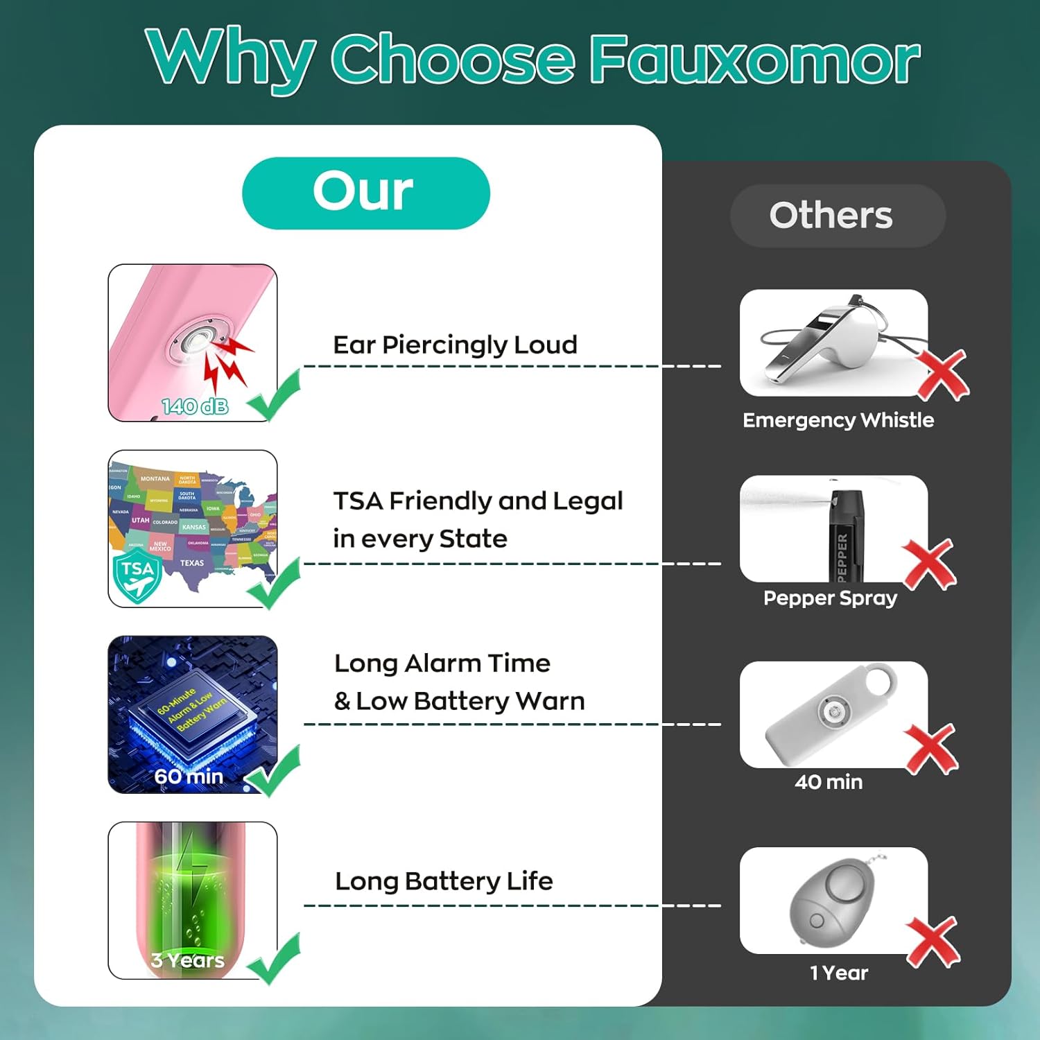 - Safety First: Unlike traditional pepper sprays or tasers, the Fauxomor safety keychain alarm set for women provides a non-violent yet highly effective way to ensure your safety. When threatened, its 140-decibel loud siren birdie sound and high-intensity strobe LED light can distract and scare off attackers while quickly drawing attention from other people to help you.