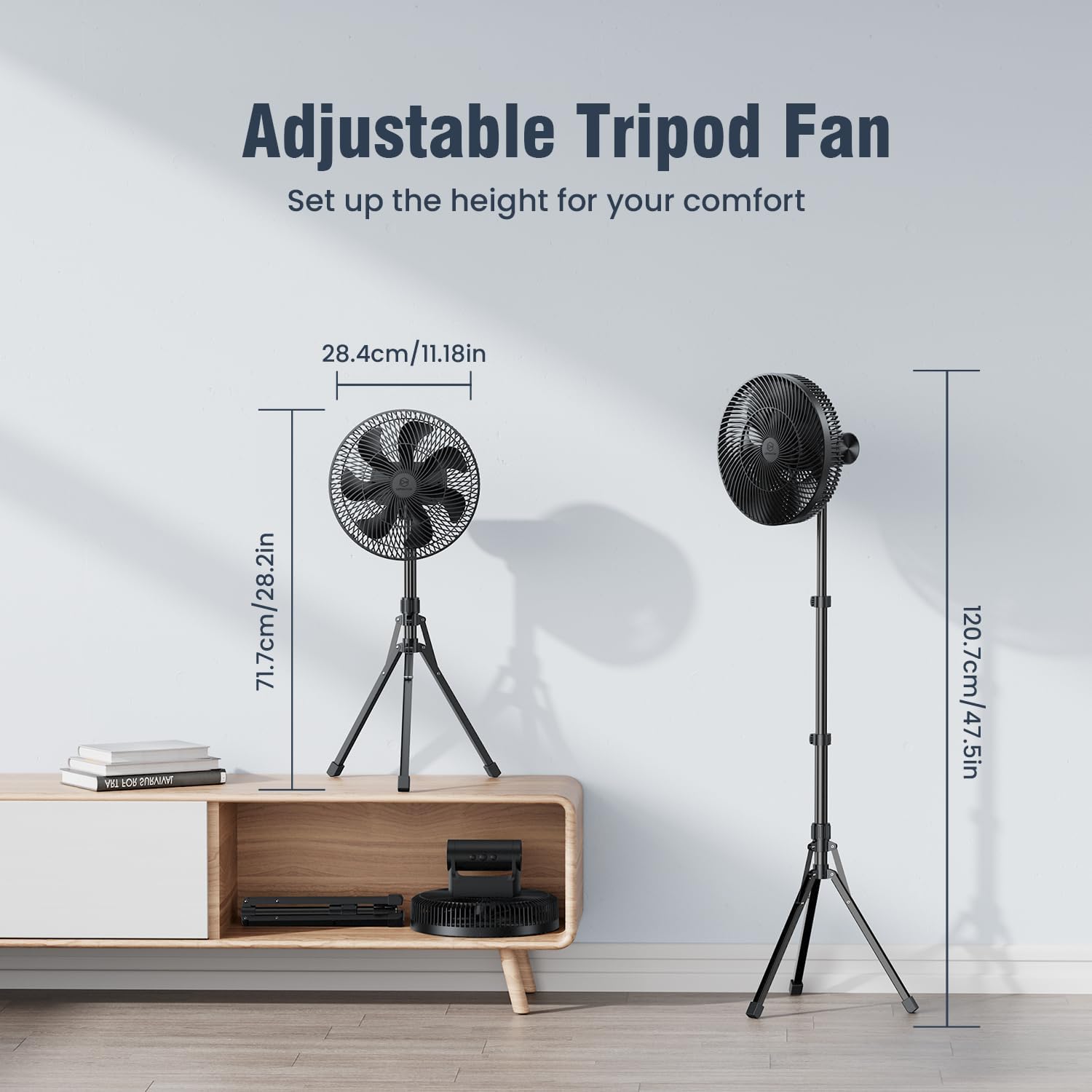 - Flexible Tripod Fan with Multiple Function: The height of this standing fan is adjustable from 28” to 47”(70-119cm) so you can position the cooling airflow right where you need it; tilt the fan head up or down(manual tilt up 90°, down 25°) to set up the angle per your desired. It can circulate fresh air around the office, bedroom, kitchen, indoor and outdoor