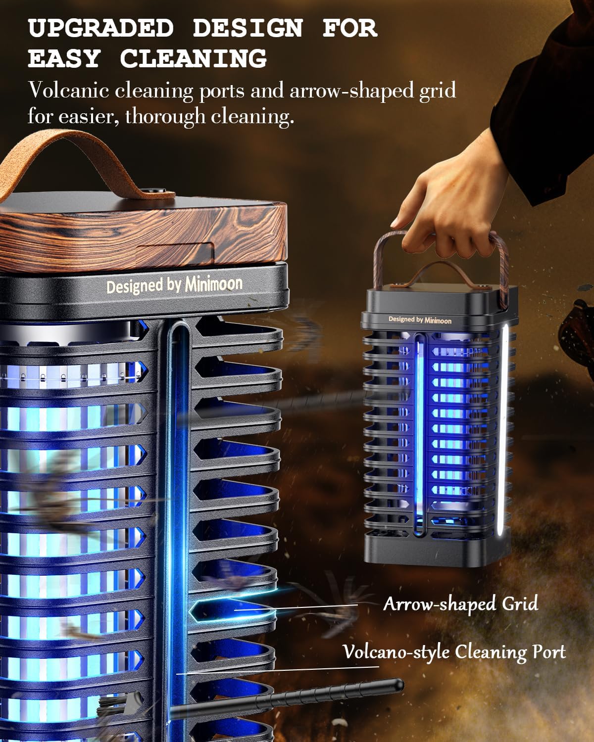 - 【Upgraded Easy-Clean Design】The Minimoon bug zapper Features a unique volcano-shaped cleaning port for deep, thorough removal of mosquito residue. Combined with an arrow-style mesh for smooth side-to-side cleaning, covering more area in less time—effortless maintenance
