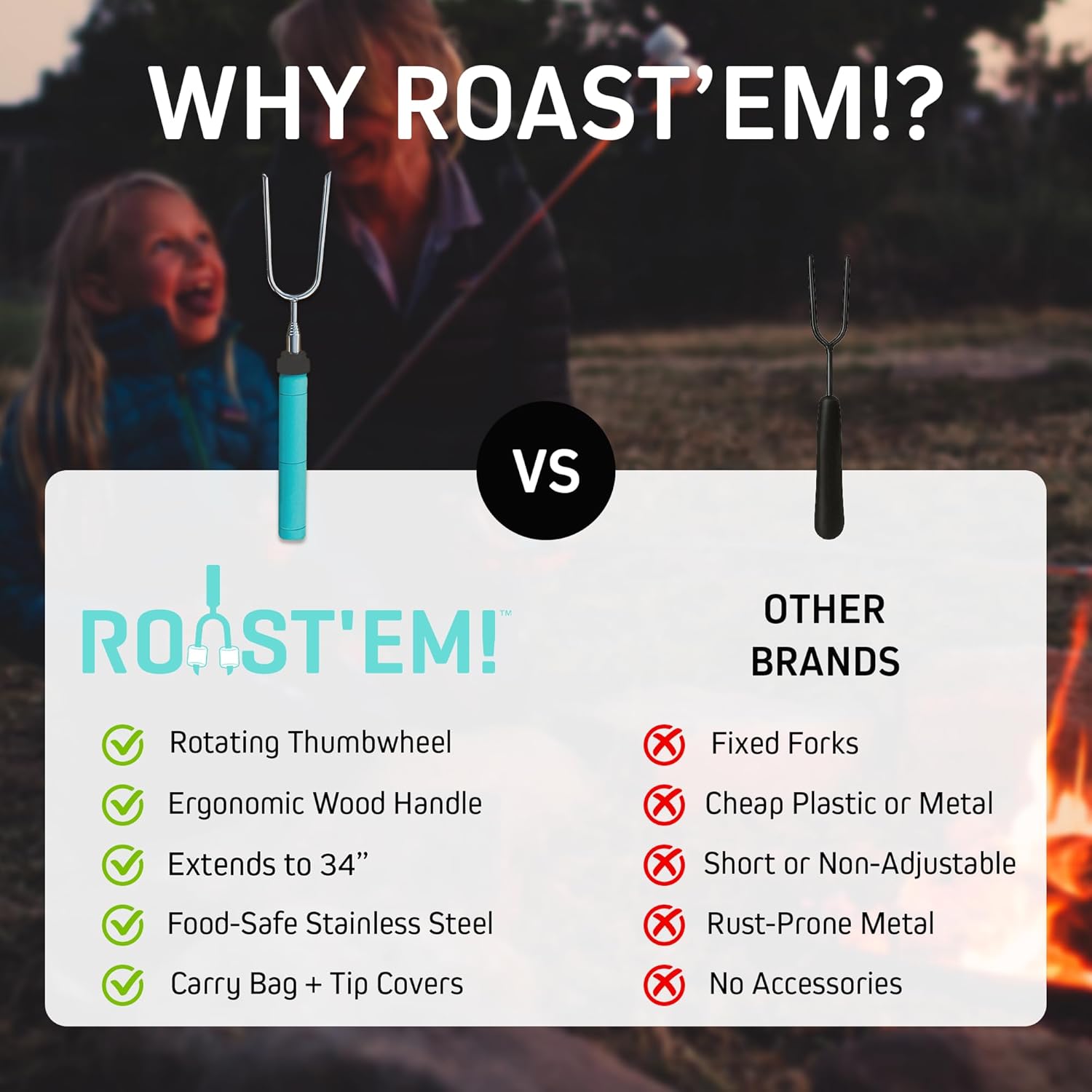 - FAST AND EVEN ROASTING! You'll love this compact camp fire cooking equipment! Our portable telescoping roasting forks includes a heat resistant carry bag and will make a great addition to your camping gear, cooking equipment or backyard campfire accessories!