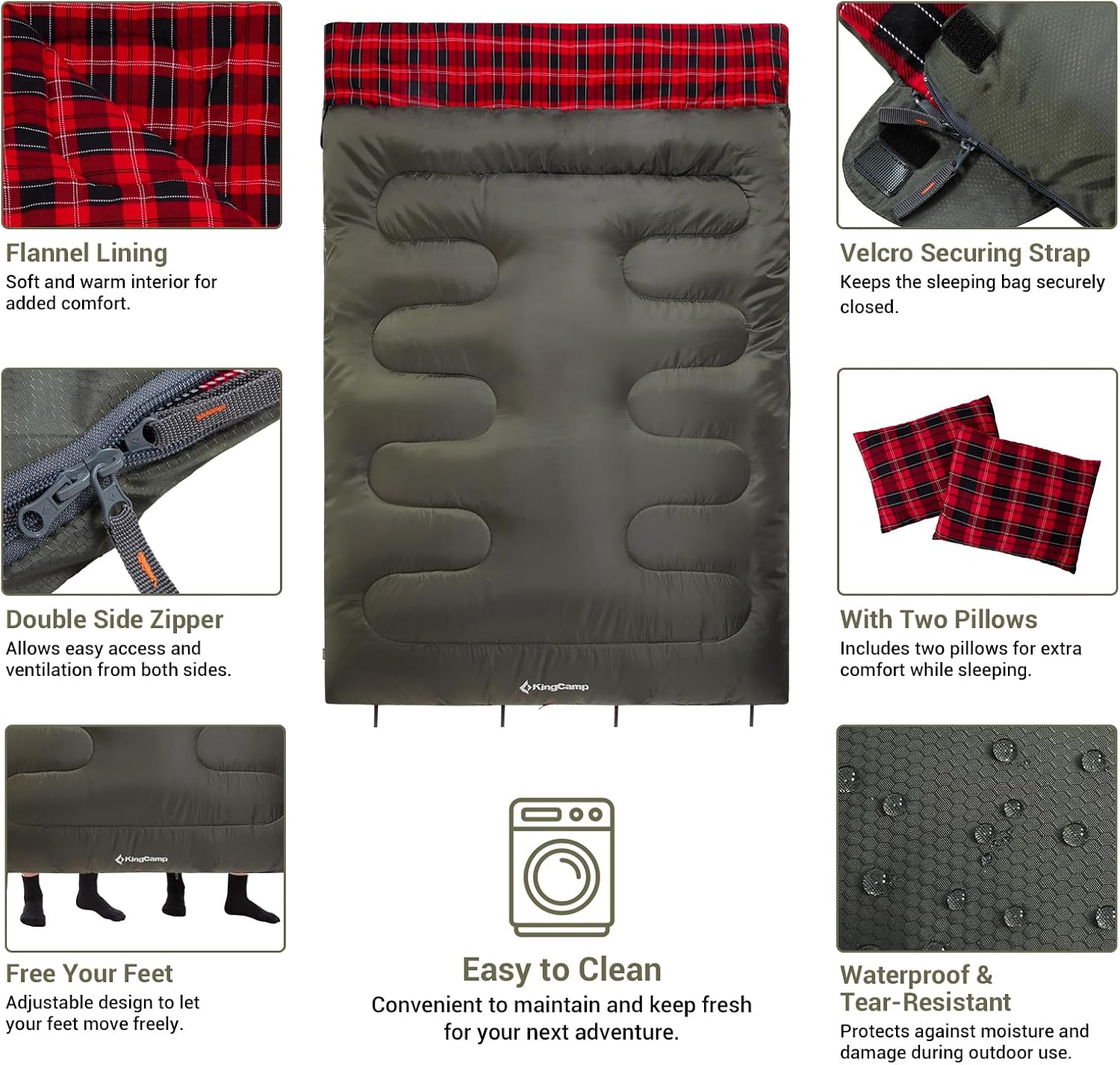 KingCamp Double Sleeping Bag for Adults, Queen Size 2 Person XXL Flannel Sleeping Bag, Waterproof Lightweight Flannel Quilt with 2 Pillows, Perfect for Couples Family Camping Hiking