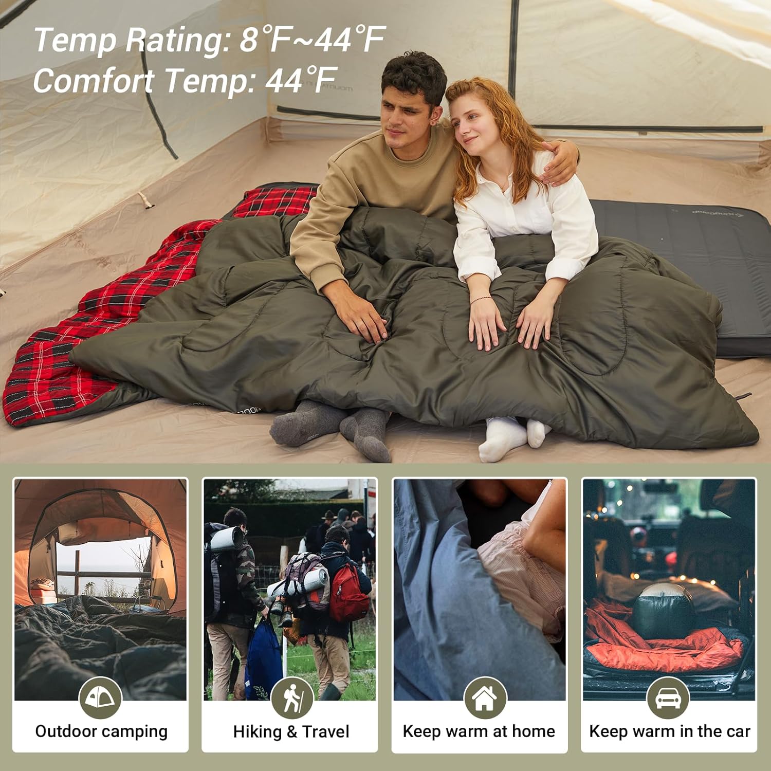- 100% COTTON FLANNEL—SOFTER, WARMER, MORE COMFORTABLE: Lined with premium 100% cotton flannel—not synthetic blends—this sleeping bag feels incredibly soft against your skin and locks in warmth naturally. The breathable brushed flannel offers excellent insulation, ensuring you stay cozy in cooler weather. With an extra-thick design, our 2 person sleeping bag minimizes heat loss, keeping you comfortable and warm for an uninterrupted sleep.