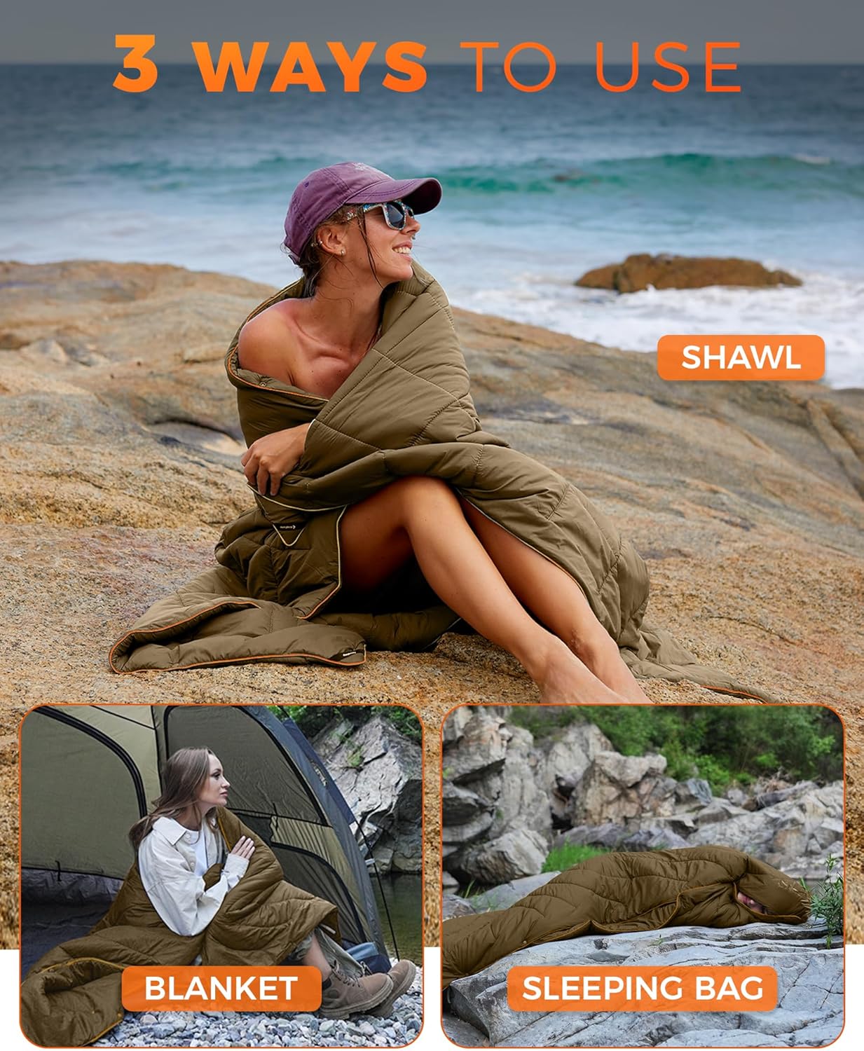 - WEARABLE, HANDS-FREE DESIGN & EXTRA-LARGE COVERAGE FOR TWO: With snap buttons for easy transformation, this puffy camping blanket can be worn like a shawl or cape, keeping your hands free for walking around the campsite, watching outdoor sports, or relaxing by the fire.