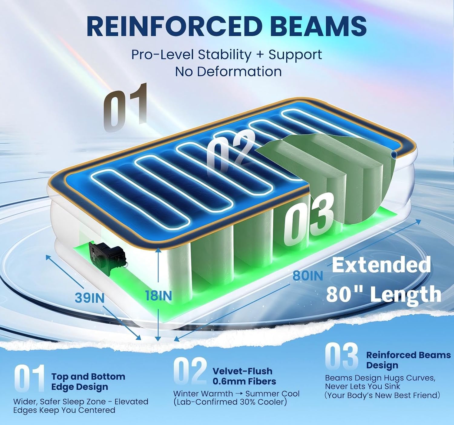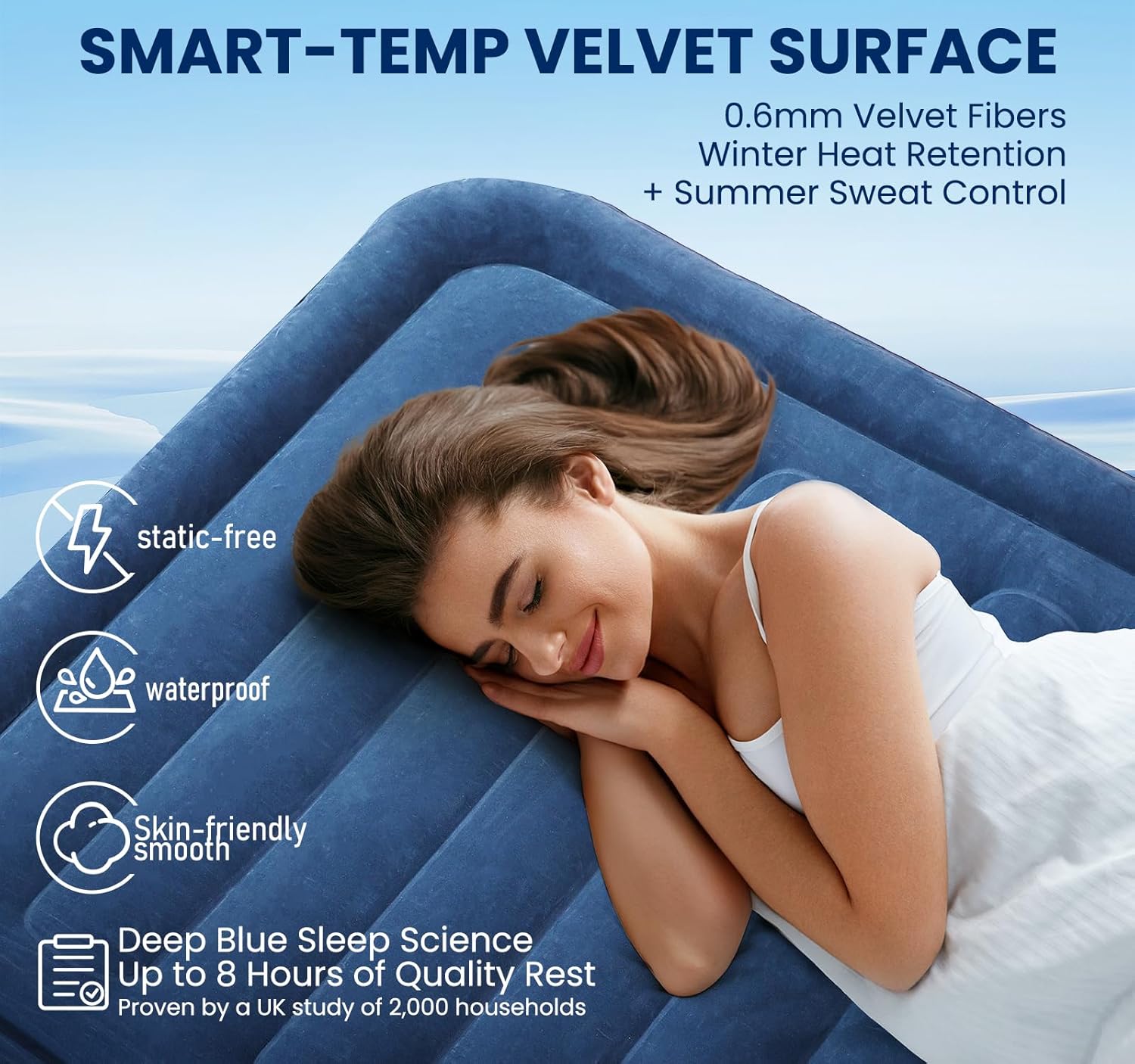 - Smart-Temp Velvet Surface: This inflatable mattress features a 0.6mm ultra-fine velvet layer that retains heat in winter and wicks away sweat in summer, while offering static-free, waterproof, and skin-friendly benefits. Validated by a UK study of 2,000 households, the blue fabric can provide up to 8 hours of deep sleep, cradling you like a premium mattress with every dream