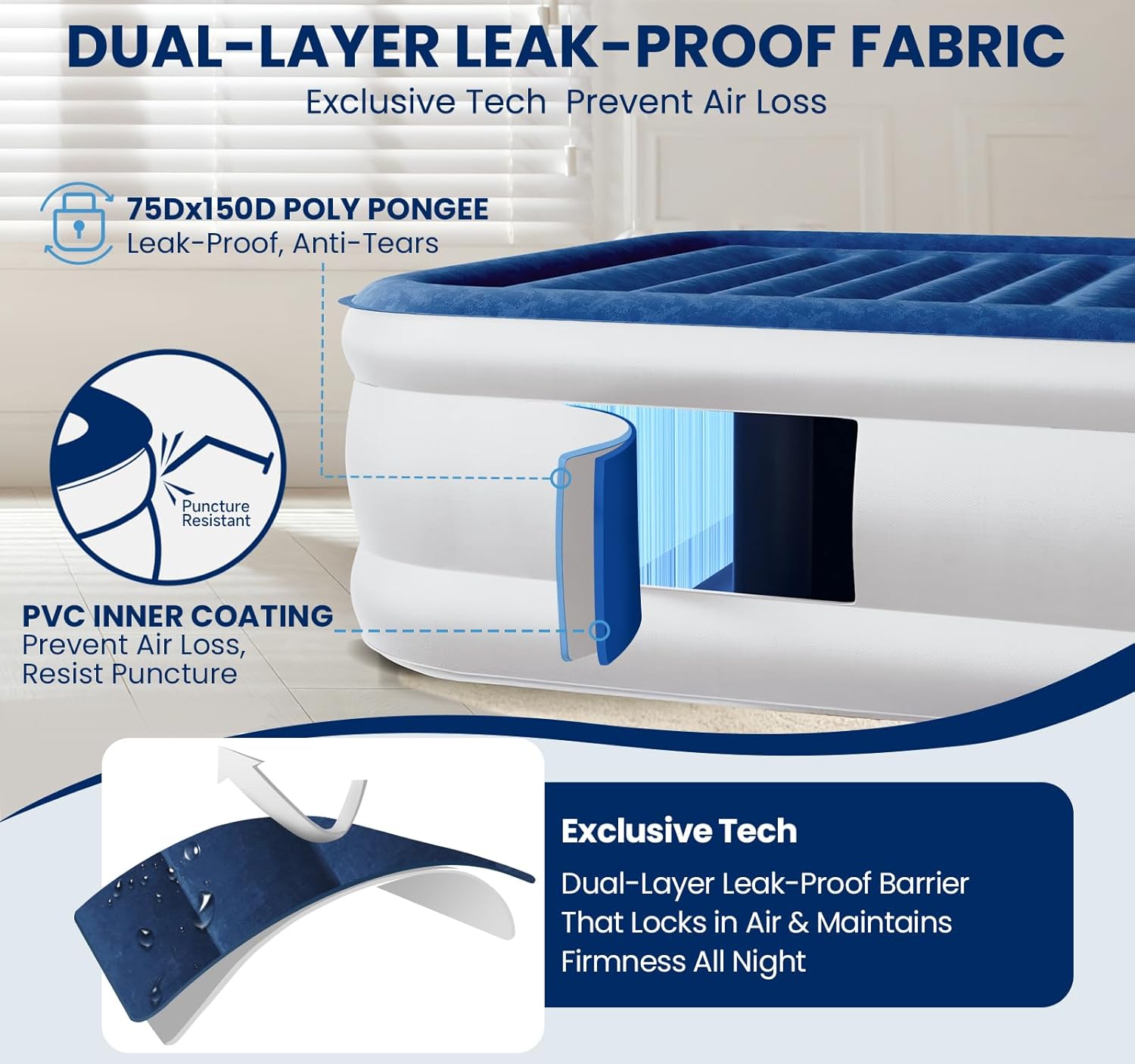 - 5X Stronger Than PVC & Supports up to 500 lbs: Air mattress Twin XL features a dual-layer leak-proof fabric—combining a durable Poly Pongee outer layer with a PVC inner core—for enhanced resistance to leaks, scratches, and tears. With 5X the structural strength of standard single-layer PVC mattresses, it delivers lasting durability and peace of mind night after night