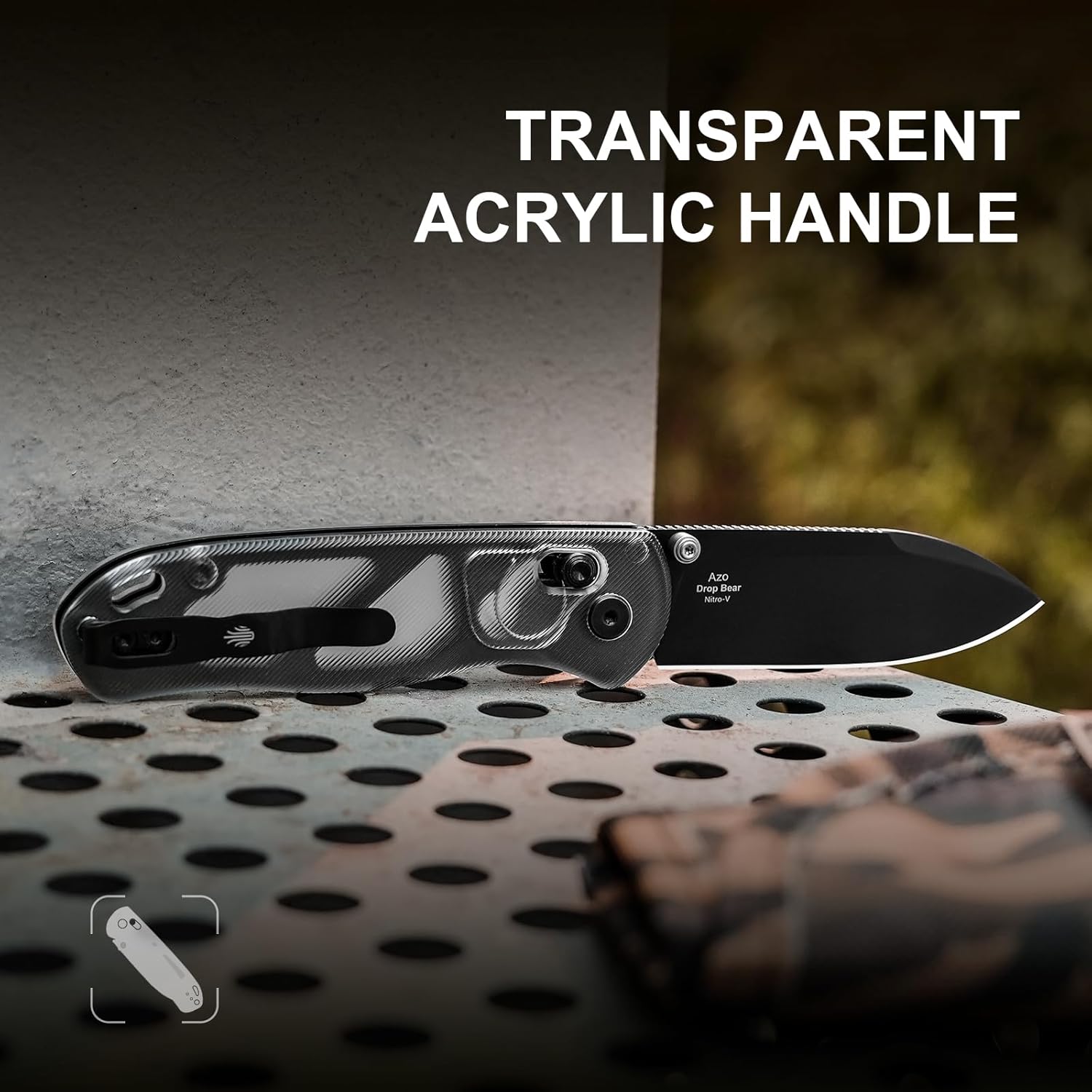 - Transparent Acrylic Handle - Kizer Drop Bear folding knife features transparent acrylic handle, being lightweight and visually appealing,showcasing the skeletonized liner. Weight reduction skeletonized Liner visible through the transparent handle, reduces weight while maintaining strength.Well-Chamfered handle pocket folding knife Ergonomically designed for comfort and secure grip.