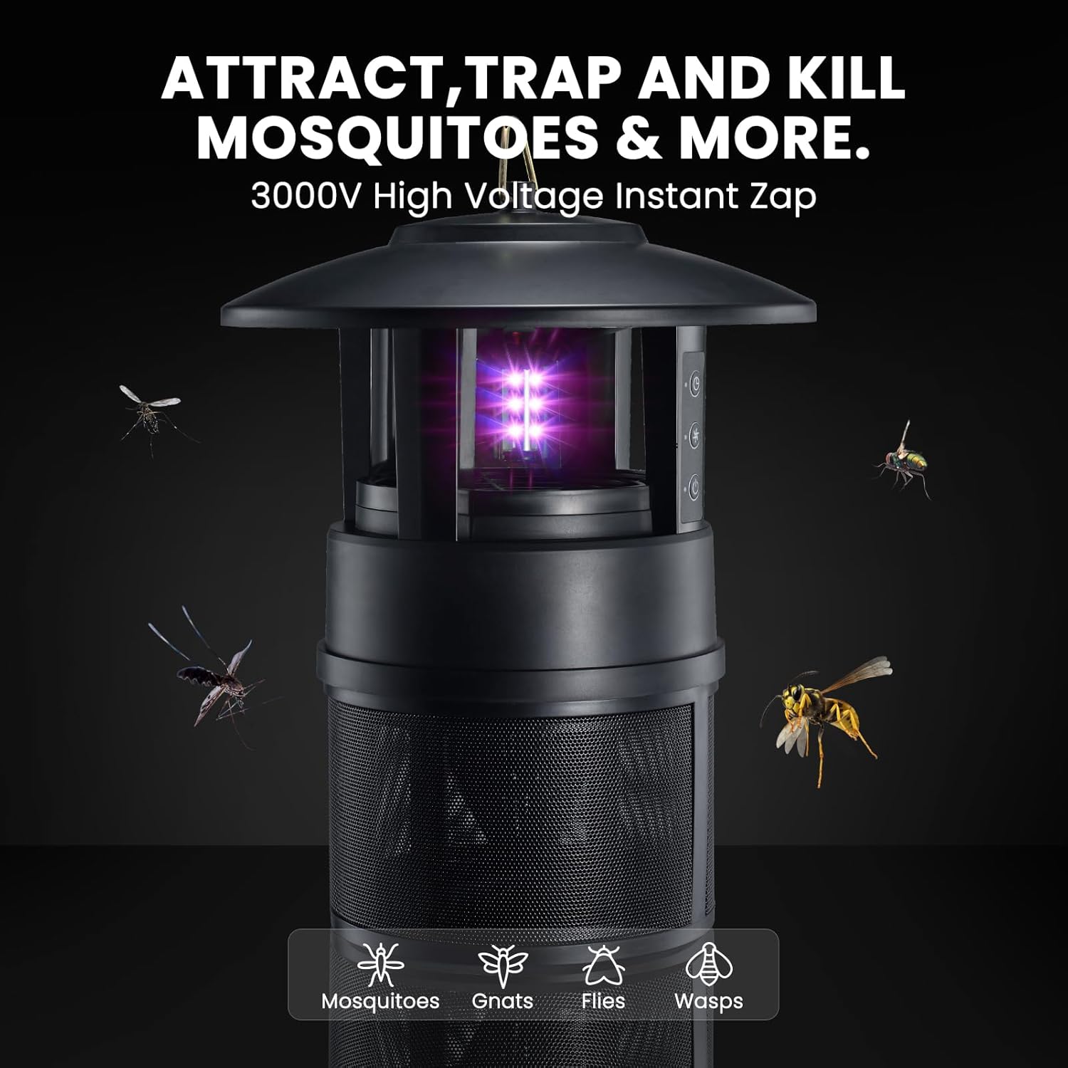 - Weather-Resistant & Hassle-Free Maintenance – 10.24 inch extended rainproof canopy protects internal components, while the detachable bug catcher basket with included scrubber allows quick cleaning in 30 seconds - no messy chemicals or sticky traps.
