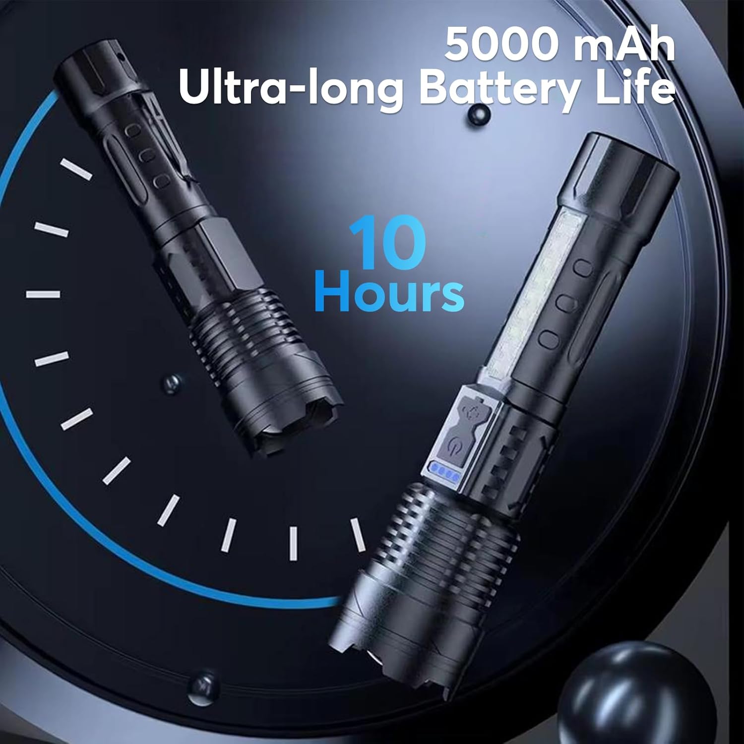 - 【Rechargeable & Long-Lasting】Powered by a high-capacity 5,000mAh battery, each flashlight offers up to 12 hours of runtime on High Mode. Fast Type-C charging fully recharges in just 3 hours. Includes a 4-stage battery level indicator with ±5% accuracy.
