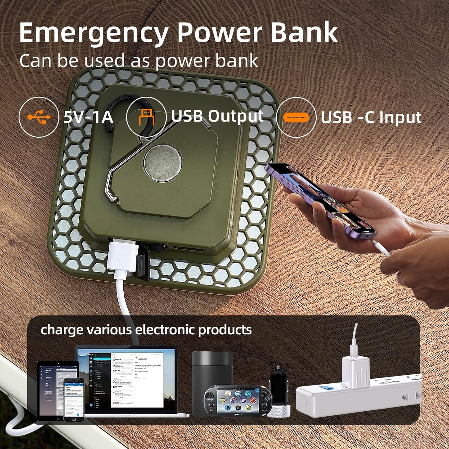 - 【Rechargeable & 10800mAh】Trliradyn camping lights rechargeable by Type-C port ( included usb-c cable), 10800mAh battery can also be used as a supply to power your Phone or other devices in case of hurricanes or power outages.