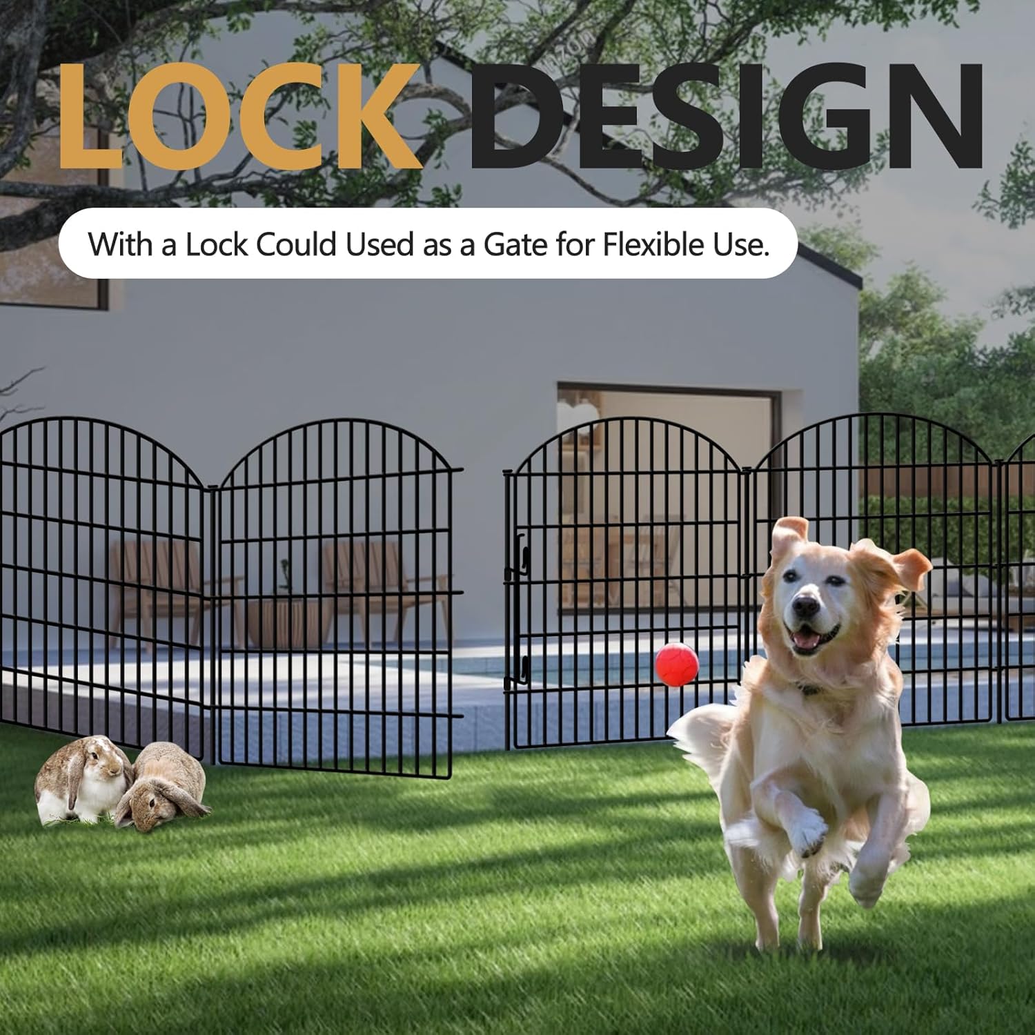 - MORE AVAILABLE SIZE: The classic arch shape design garden fence single piece measures 26.77" wide, 33" high, 1.5" gap. Comes with 16 metal stakes are 44" in height, which can be inserted into about 12.6 inches above the ground, making it strong enough to prevent animals from entering & leaving, dog digging, and even keep rabbits away from your plants. A total of 15 fence panels with a lock, connecting 16 fence stakes, the total length of the garden fence is approximately 33.46 ft.