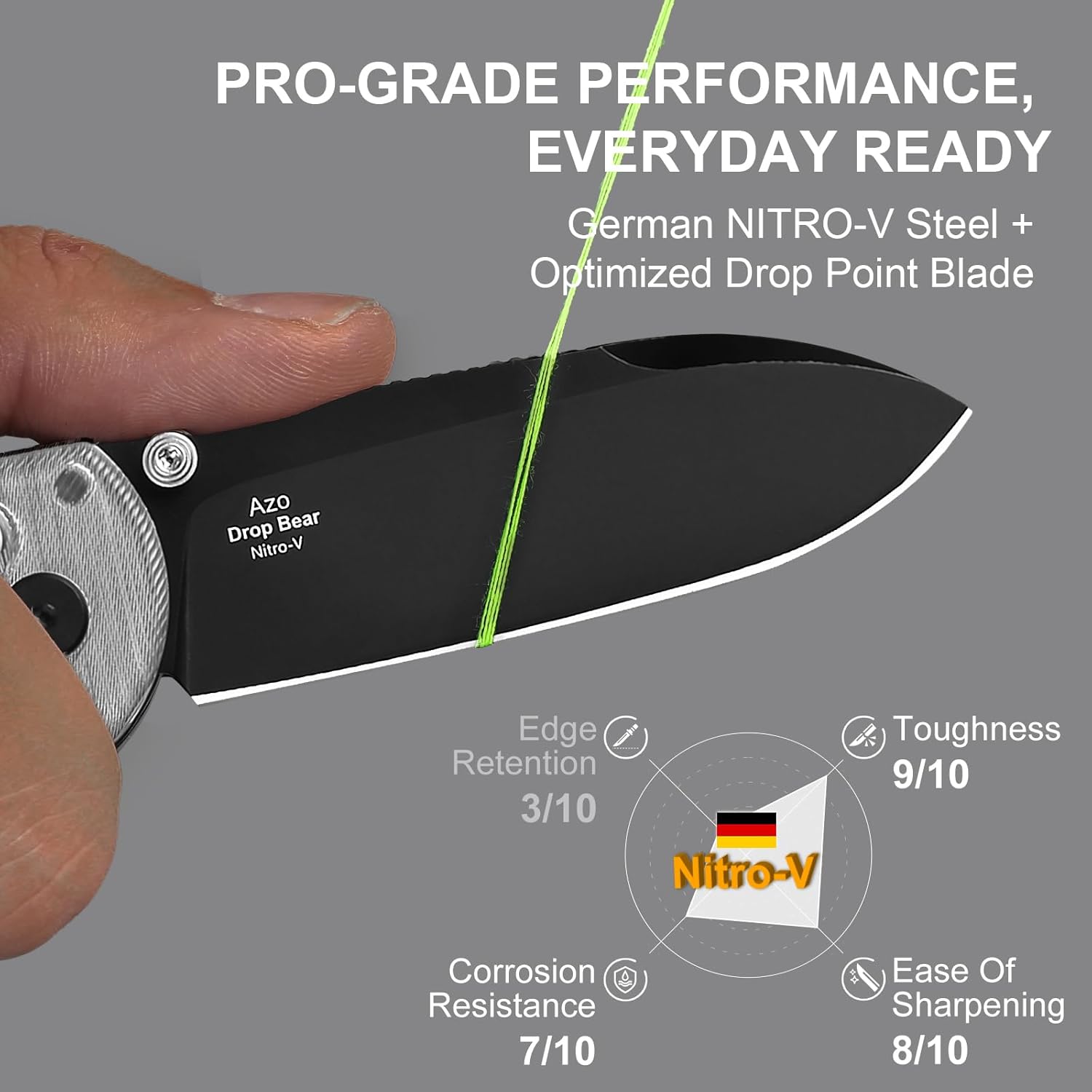 - Pro-grade Performance, Everyday Ready: Crafted from German Nitro-V steel, Drop Bear edc knife for men offering superior corrosion resistance and edge retention. The drop point blade of pocket folding knife handles daily tasks with precision, from packaging to outdoor adventures.