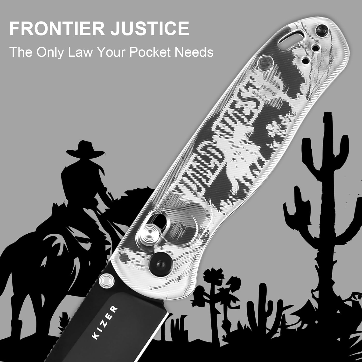 - Customized Expression, Unique Style: Kizer Drop Bear pocket knife features interchangeable laser-engraved liner paired with a transparent acrylic handle. The laser-etched cowboy galloping across the handle isn't just art—it's a call to saddle up. With lightning-fast deployment, Drop Bear folding knife channels the spirit of those who ride ahead, cut first, and never look back. A great gift for men women who likes camping, hiking, exploration, fishing, backpacking.