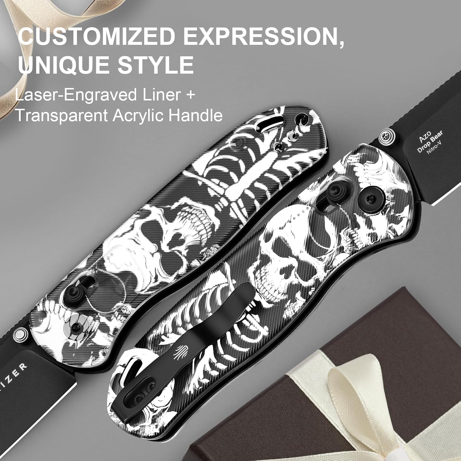 - Customized Expression, Unique Style: Kizer Drop Bear pocket knife features interchangeable laser-engraved liner paired with a transparent acrylic handle. Lightweight yet eye-catching, perfect for showcasing individuality.A great gift for men women who likes camping, hiking, exploration, fishing, backpacking.