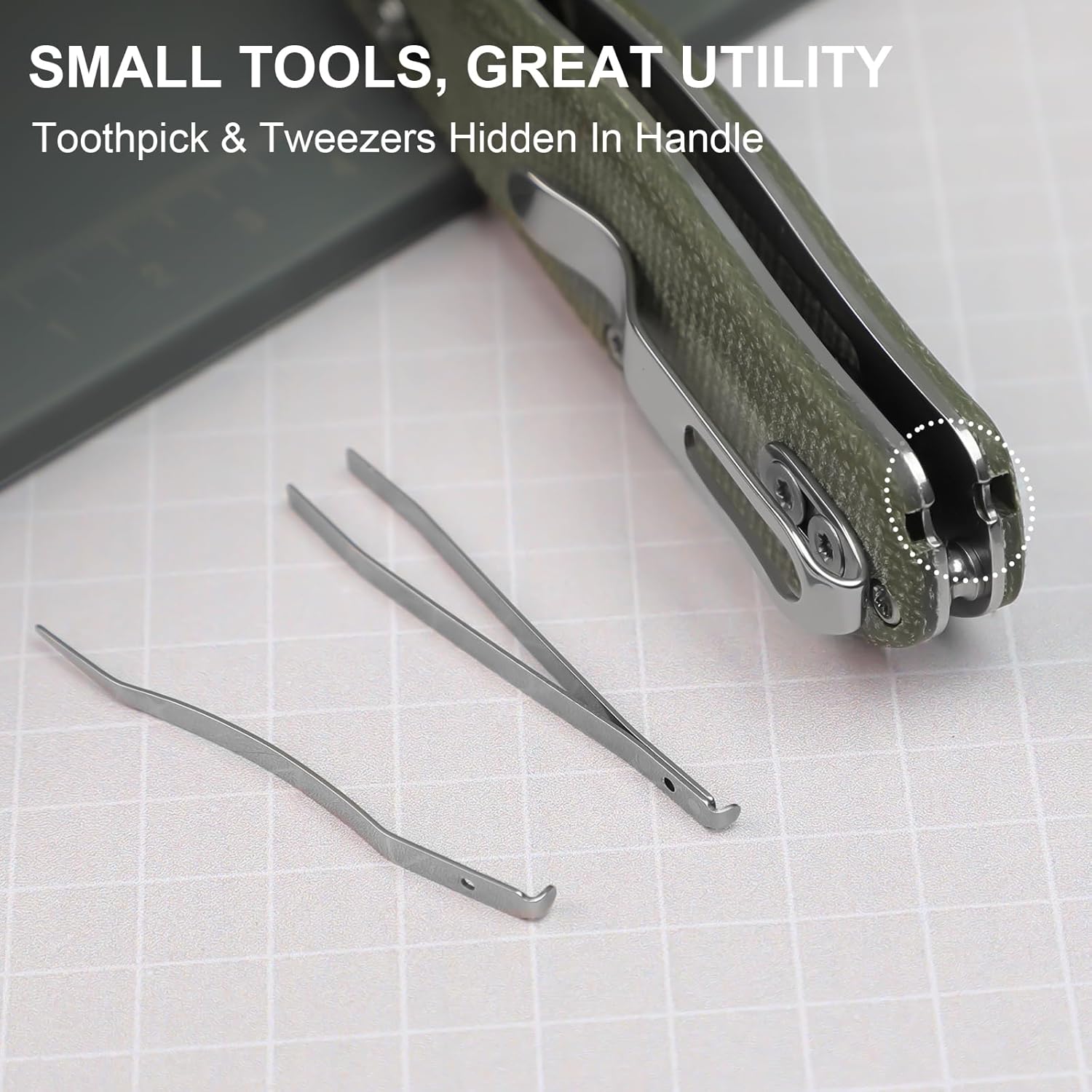 - Small Tools, Great Utility: Streamlined handle of folding utility knife conceals stainless steel tweezers and toothpick. Quick-access slots maintain clean aesthetics while providing essential tools for daily needs like splinter removal or precision handling.