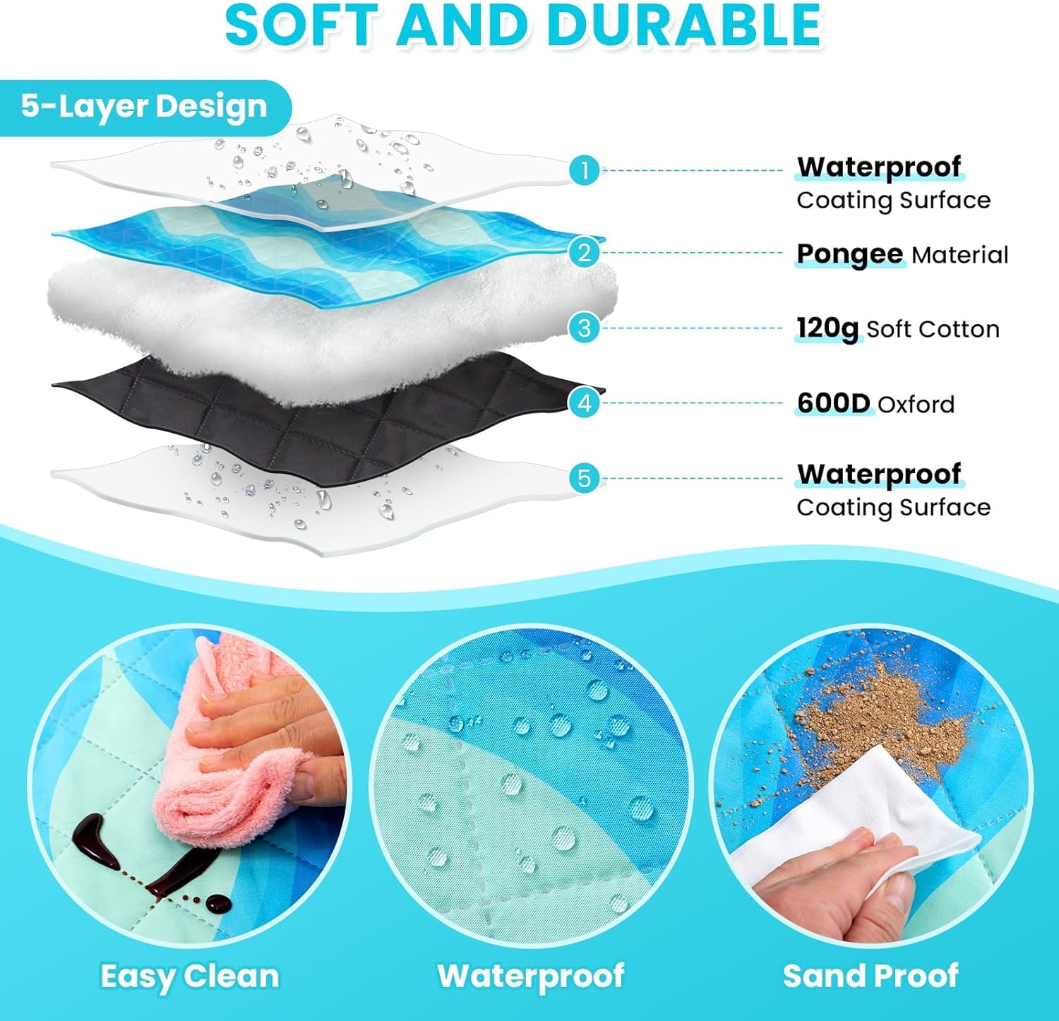 - SAND PROOF AND WATER RESISTANT-Made of 5 layers, it can prevent water effectively that always keep the mat dry. It is sand-proof that you can get rid of the sand easily by grabbing a corner of the blanket. Perfectly suitable for siting or lying on grass, beach, floor or any kindly of surface, giving you soft and comfortable feelings