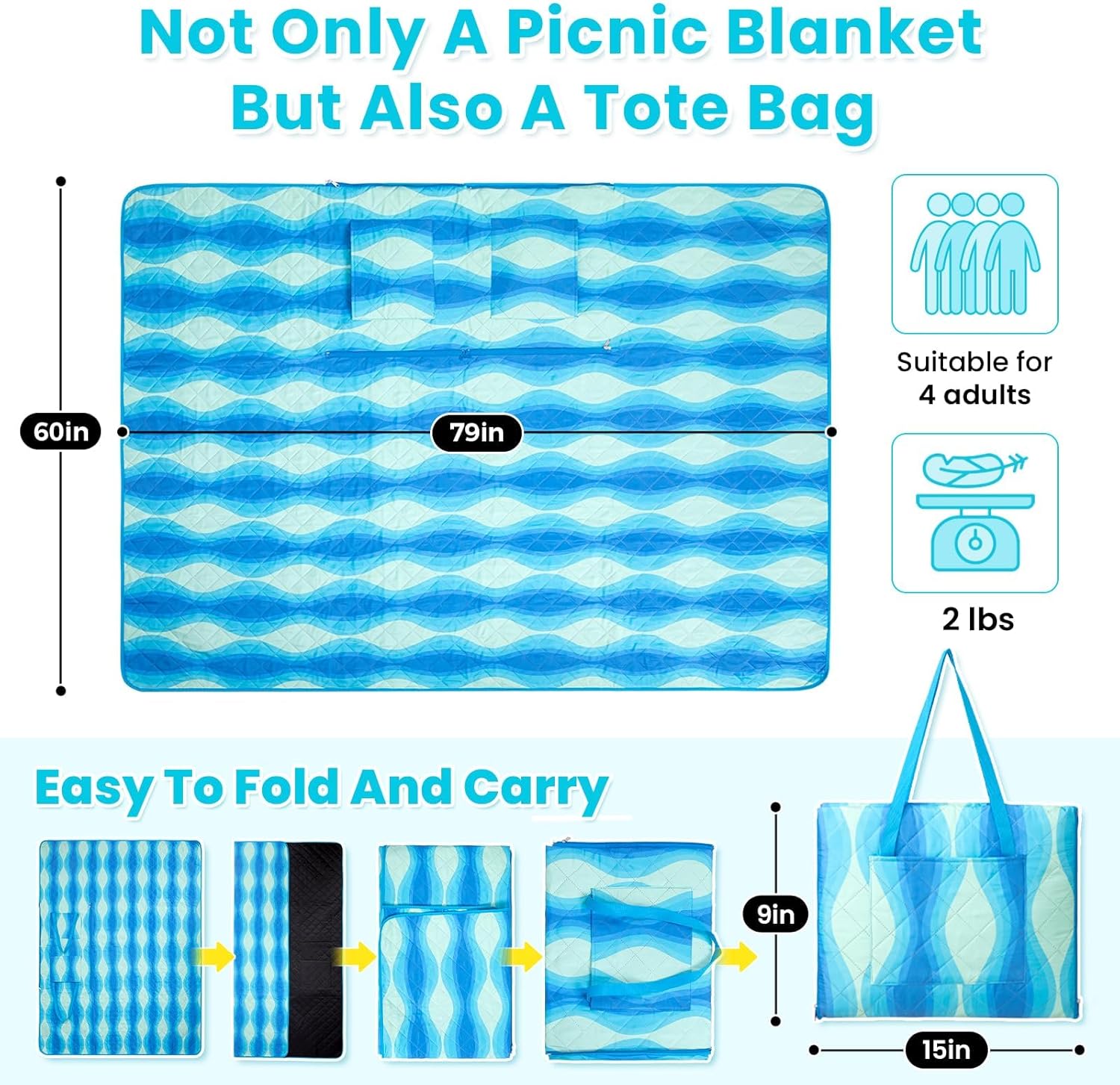 - 3-IN-1 DESIGN – Blanket, Bag & Storage More than just a picnic blanket!This durable beach blanket folds up into an easy to carry tote with carrying strap and extra large pocket to hold personal items—perfect for snacks, toys, wipes, or small essentials.