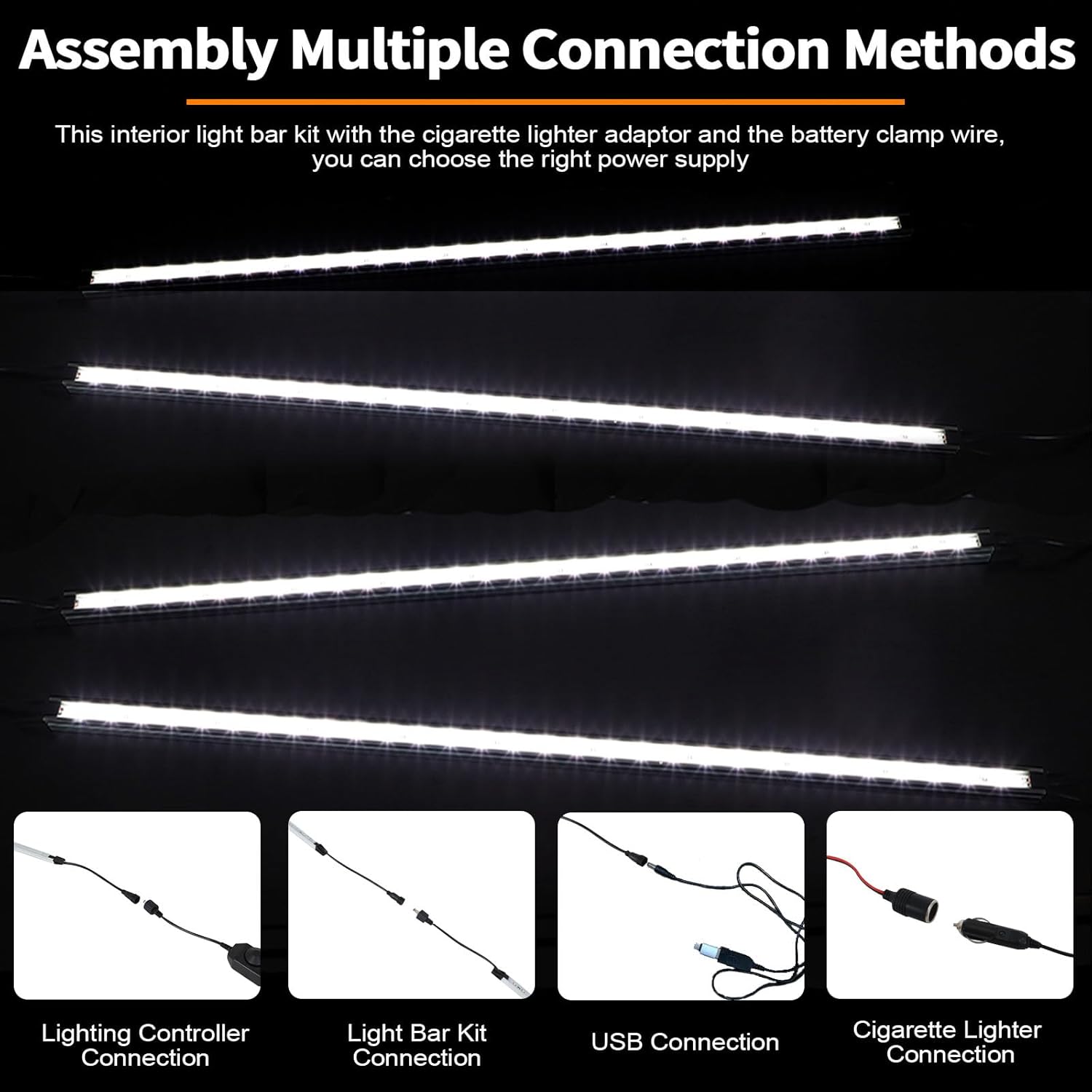 - 【COMPLETE PORTABLE SET】4 x 22-inch 12v led light, 1 x cigarette lighter plug connector cable, 1 x battery clip connector cable, 1 x dimmer switch, 1 x USB connector cable, 1 x TYPE-C adapter, 8 x Velcro fasteners, 3 x extension cables, 1 x portable bag