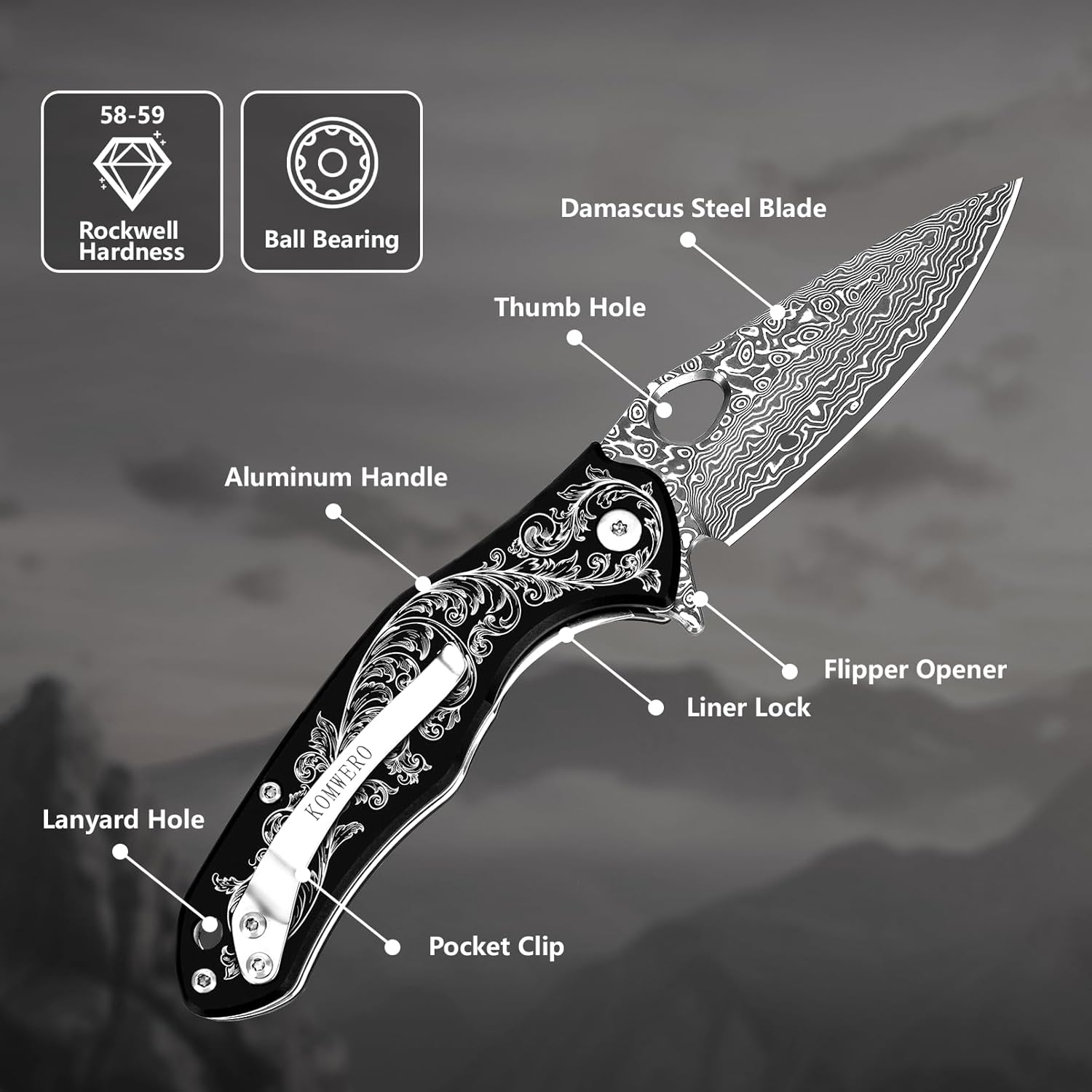 KOMWERO Damascus Pocket Knife with 2.95" VG10 Steel Blade, Folding Knife with Aluminum Alloy Non-Slip Handle, EDC Knife with Leather Sheath and Pocket Clip for Men Women Camping Survival Hiking