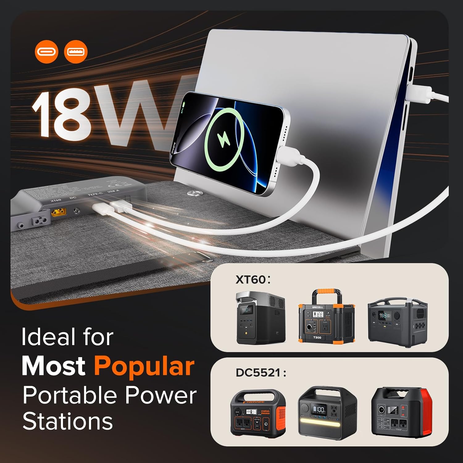 - Universal Charging Hub – Multiple Fast Outputs - Equipped with dual 18W USB-A & TYPE-C fast-charging ports, plus XT60 and DC5521 outputs. Seamlessly charge power stations (Jackery, BLUETTI, ECOFLOW), phones, tablets, drones, and laptops—no adapter needed. Smart IC chip delivers optimal charging speed with full device protection.
