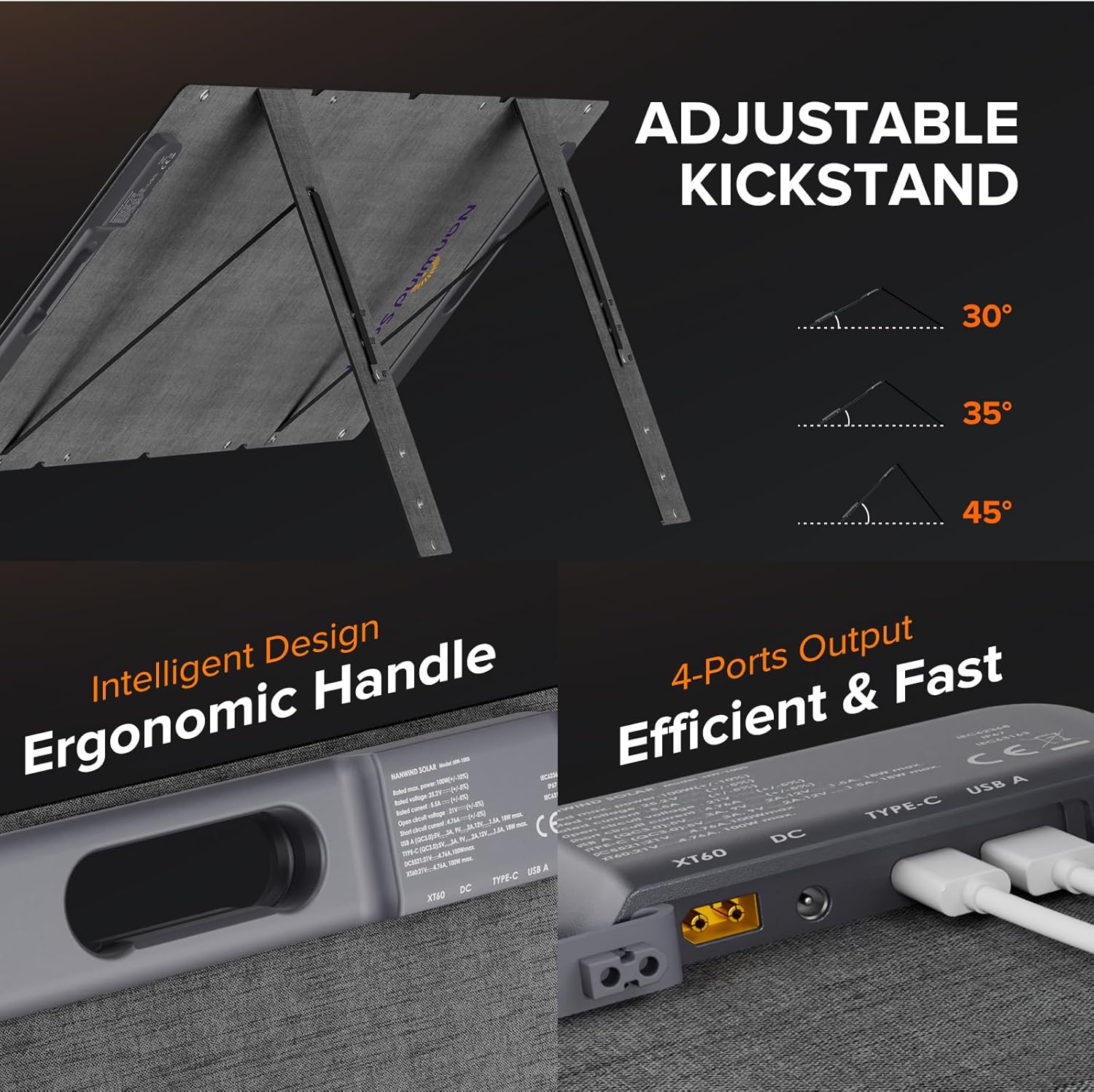 - Ultra-Lightweight, Foldable & Travel-Ready - Weighs just 4.6kg (10.14 lbs) and folds to a compact 21.85" × 15.16" × 1.8". Features an ergonomic carry handle, hidden fast-charging ports, and reinforced hanging holes. Three-position kickstand ensures the best sunlight capture—perfect for camping, hiking, RV, or emergency backup.