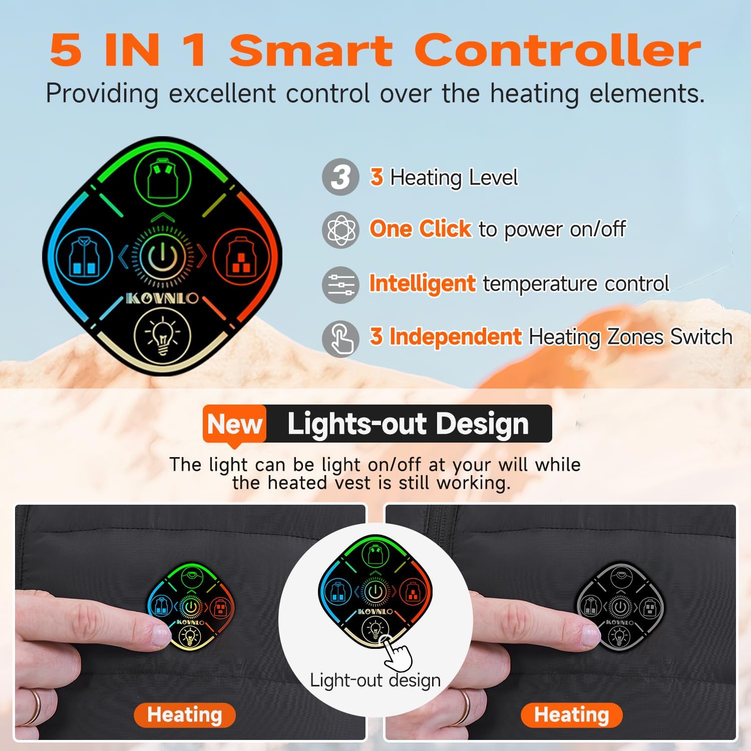 - [SMART 5-IN-1 BUTTON] :Features 3 adjustable heat levels (149°F, 131°F, 113°F) and 3 independent zones. One-touch control lets you adjust warmth easily, even with gloves. Discreet light-off design allows you to stay heated without the glow—ideal for night work, hunting, or outdoor activities.