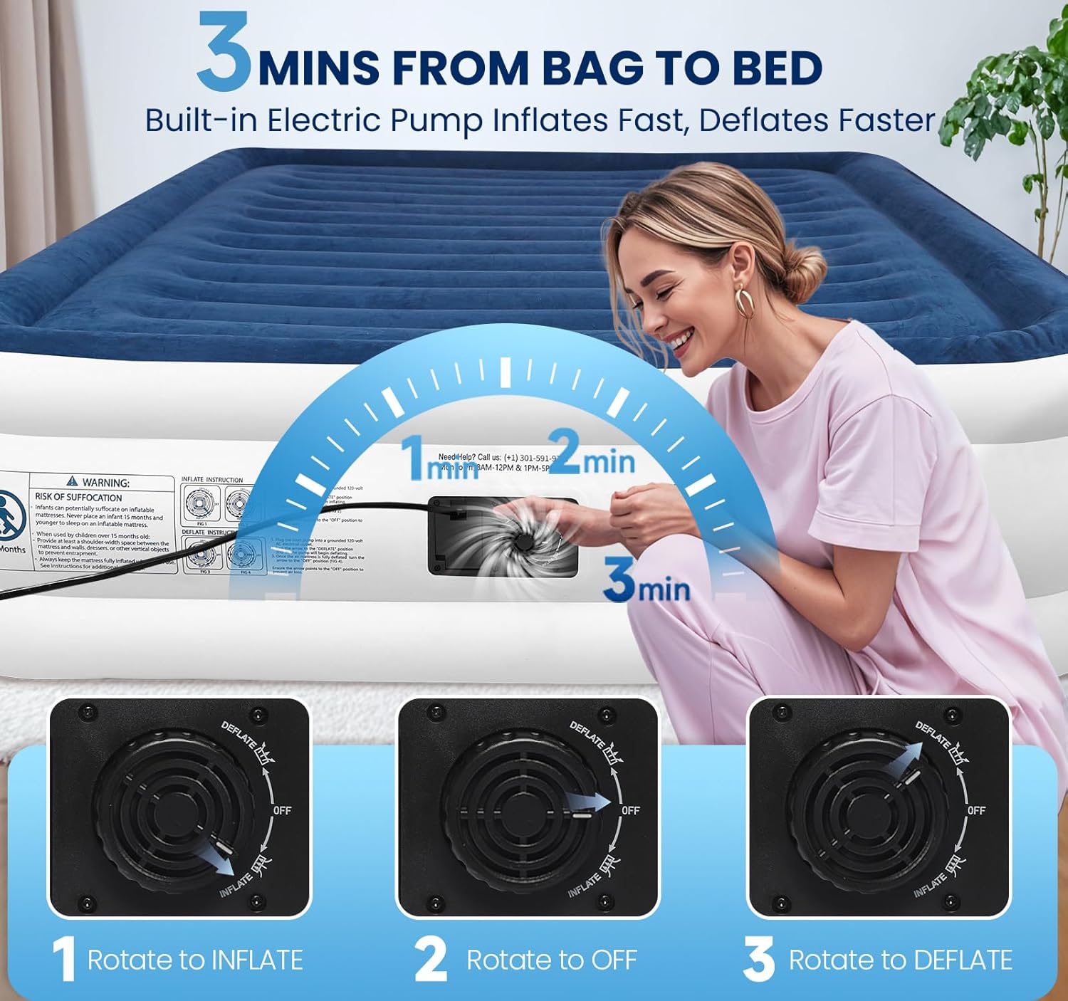 - 3-Minute Rapid Inflation/Deflation: Equipped with a built-in electric pump, this colchon inflables queen inflates and deflates in just 3 minutes. Inflatable queen airbed quick and efficient setup means you can go from bag to bed almost instantly, leaving you more time to relax and enjoy your rest