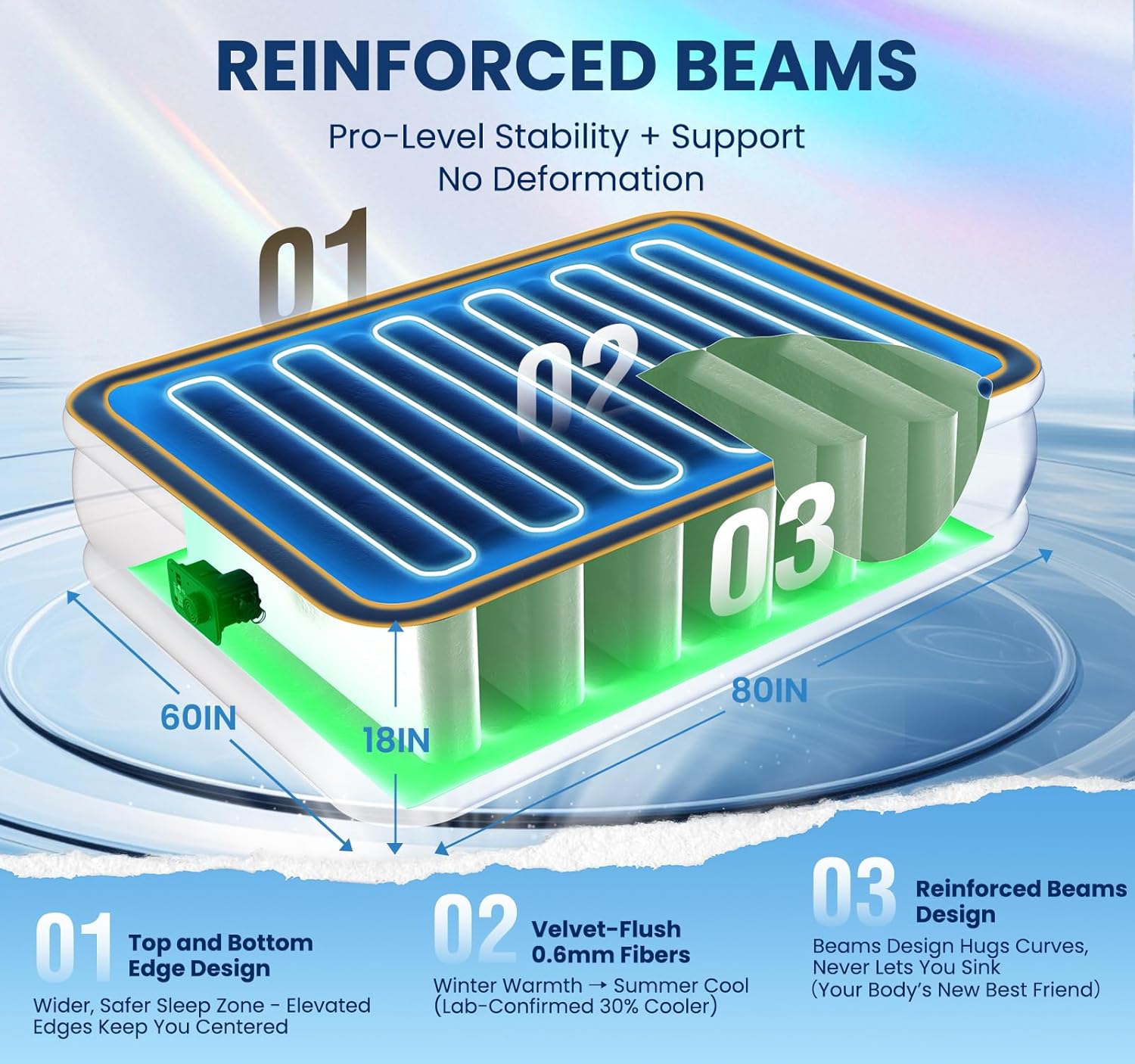 - Comprehensive Support: Queen blow up mattress innovative support system features both top and bottom edge designs alongside the our beam structure, which evenly distributes body weight and prevents sagging. The 18-inch elevated design not only makes getting in and out of bed easier, but also provides moisture resistance and heat insulation, ensuring that every turn leaves you feeling secure and cozy