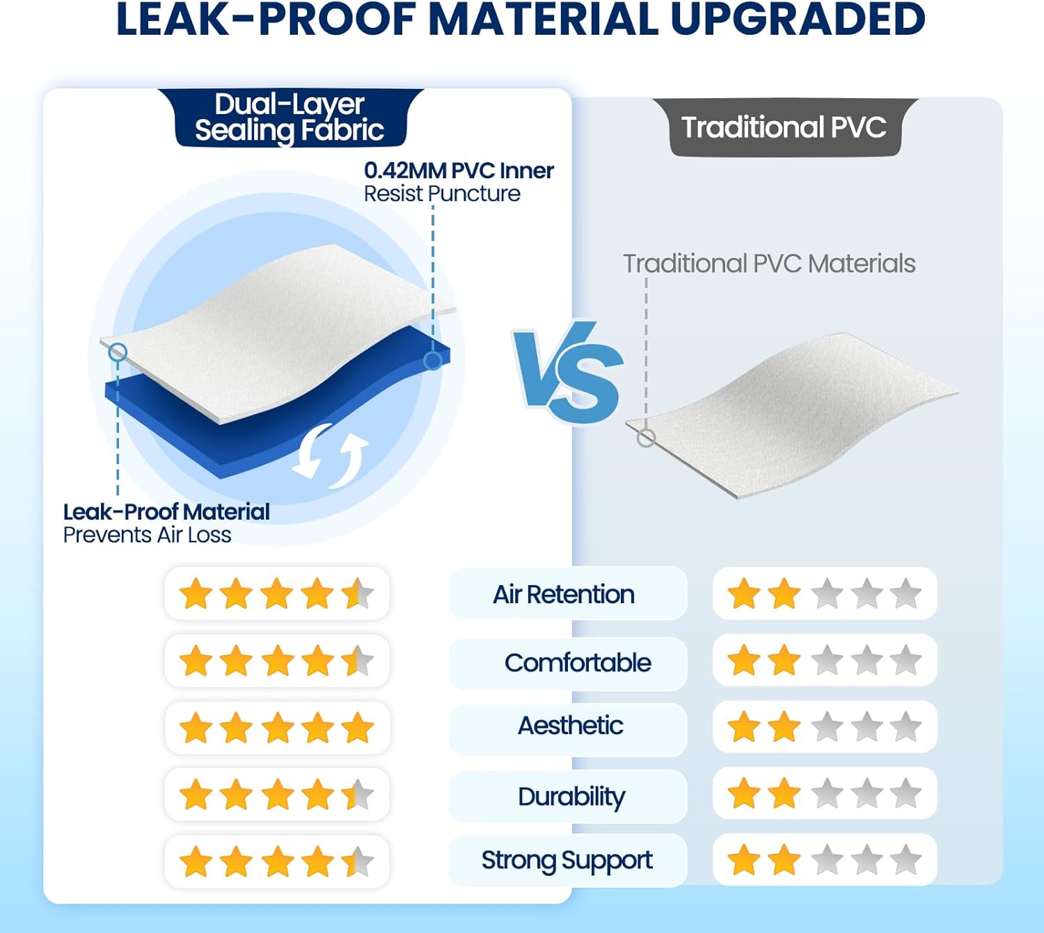- 5X Stronger Than PVC & Supports up to 800 lbs: This queen air mattress with built in pump features a dual-layer leak-proof fabric—combining a durable Poly Pongee outer layer with a PVC inner core—for enhanced resistance to leaks, scratches, and tears. Air mattress with 5X the structural strength of standard single-layer PVC mattresses, it delivers lasting durability and peace of mind night after night