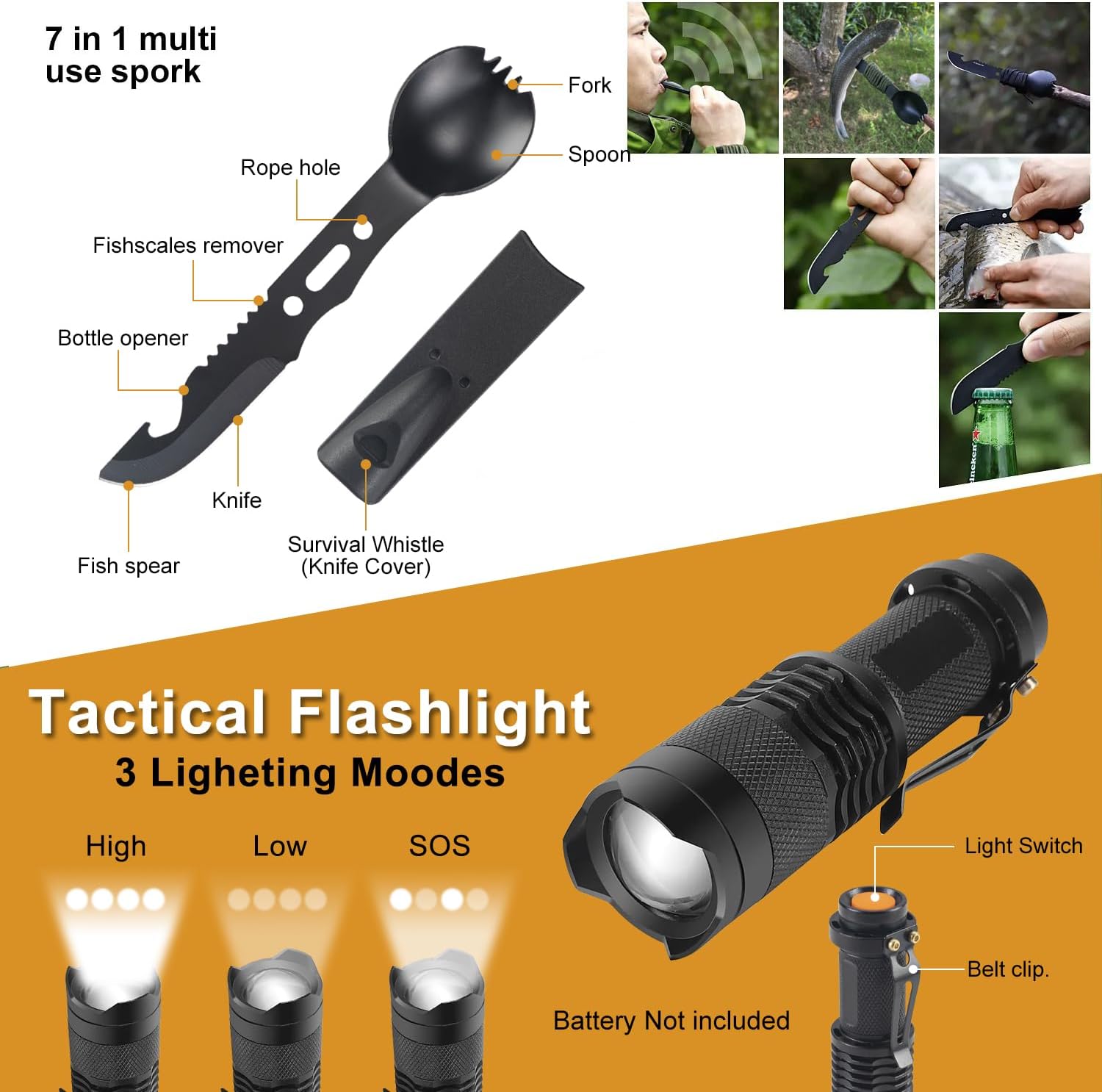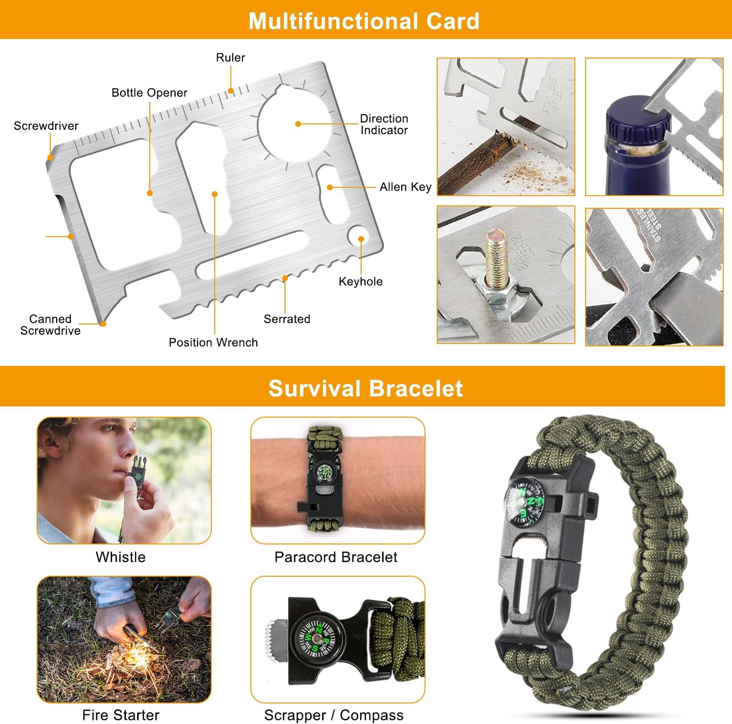 - 11-in-1 ALL-IN-ONE SURVIVAL KIT: Designed to assist in various emergency situations, our survival gear includes a wire saw, emergency blanket, fire starter, waterproof flashlight, and multi-tool card. An essential kit for outdoor adventures, car breakdowns, or natural disaster preparedness