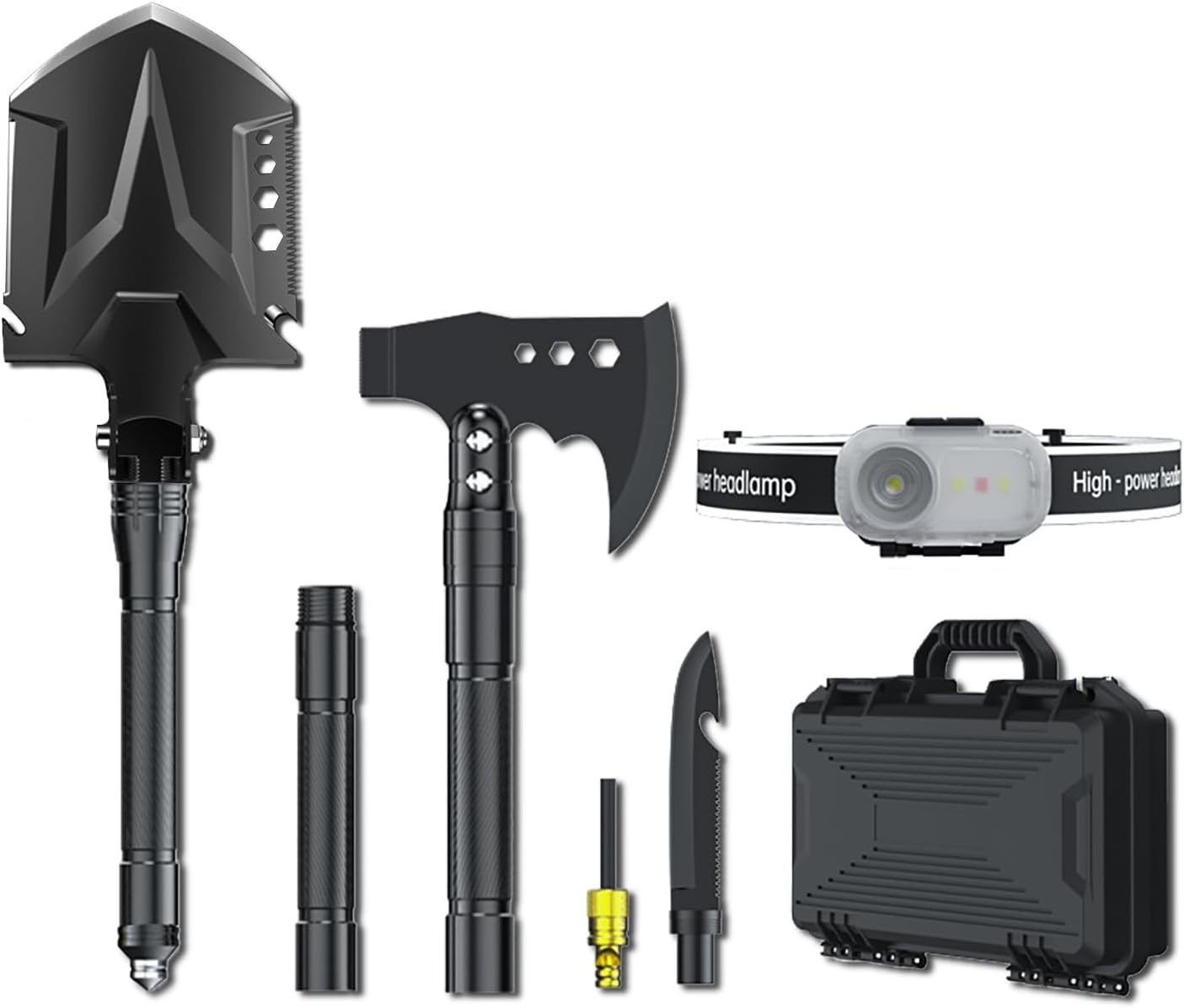 - 【ULTIMATE ALL-IN-1 SURVIVAL KIT】Complete with camping shovel, axe, survival knife, whistle fire starter, compass and headlamp-equipped extendable handle, and portable storage - every essential for wilderness survival in one tactical set.