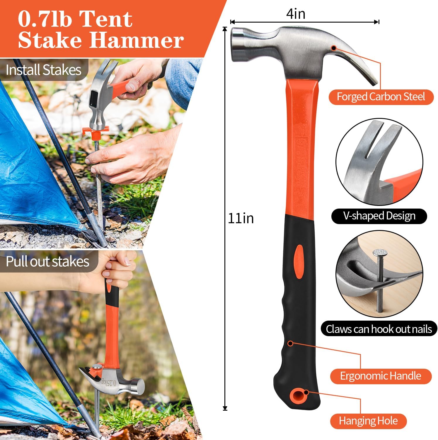 - 【Multifunctional Hammer Head】- The hammer head is made of forged high-carbon steel, which can quickly hammer nails into the ground. And the olecranon hook can pull out the tent stakes easily from the ground.