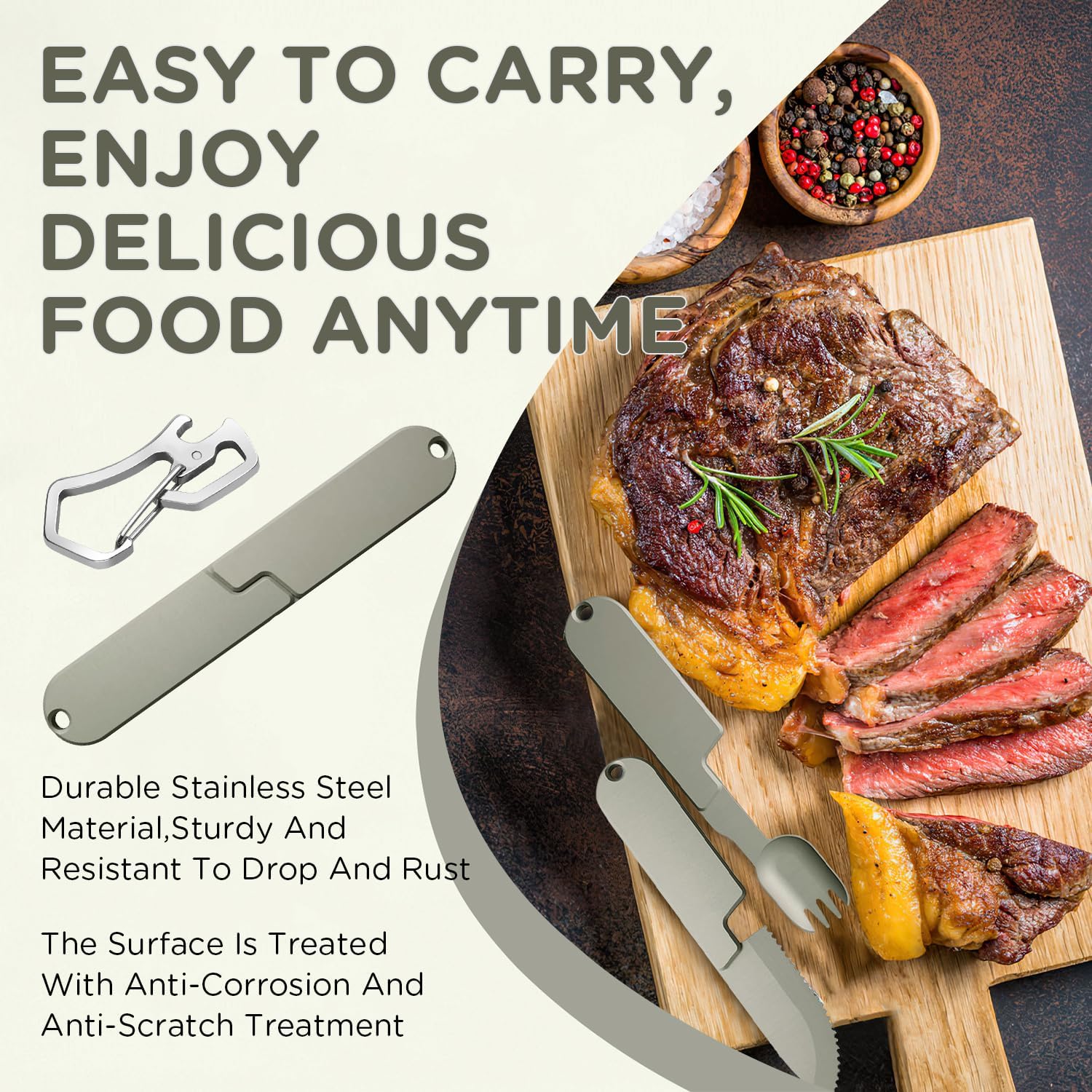 - 2 ALL-IN-ONE CAMPING UTENSILS:This camping utensils cooking set consists of a fork and spoon combined in a streamlined design that slides together effortlessly,suitable for slipping into backpacks,pockets,and allowing you to cut and fork your food with ease when dining outdoors,making outdoor dining simple and effortless,and saying goodbye to flimsy disposable cutlery or bulky other utensils