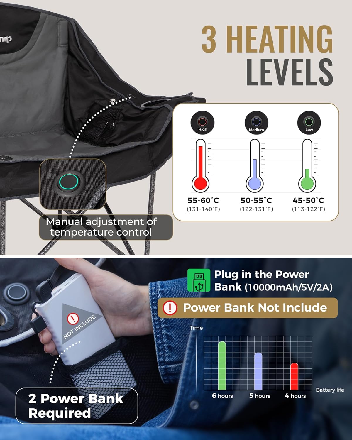 - 【Power Bank Not Included】Please note: Power banks are NOT INCLUDED.Heating performance depends on battery capacity and outdoor temperature, and warmth experience can vary by individual.For optimal results, it is recommended to use two power banks with USB outputs rated at 5V/2A.The larger the capacity of a power bank, the longer the heating duration.For your safety, this chair will automatically shut off after 150 minutes of operation.
