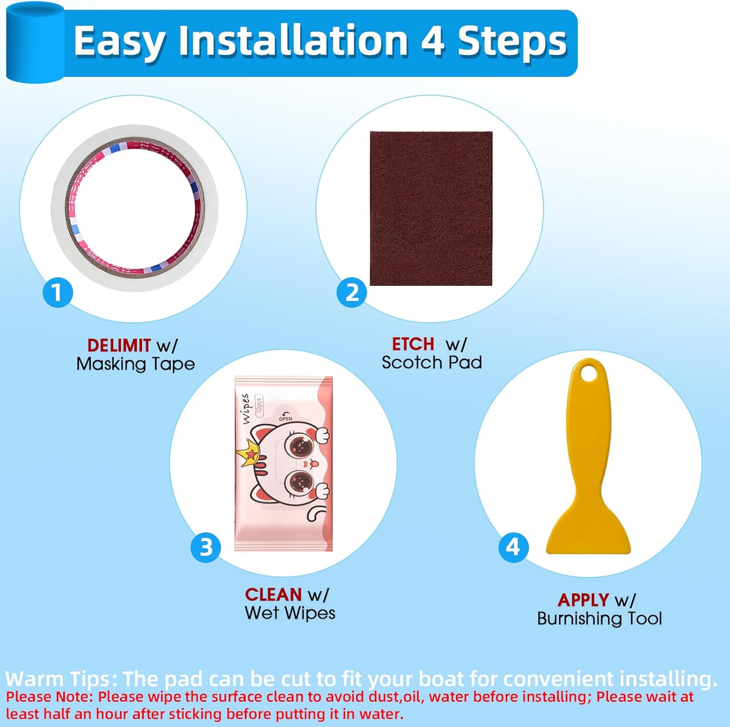 - Easy to Install with Strong Adhesion: The keel guard for kayak design of a layer of marine grade adhesive that is pre-applied. Mark the install areas; Etch and clean the surface to promote adhesion; Peel off the backing paper and apply the canoe keel guard; Simply cut to the size your need, when applying on the corner, angled and curved surfaces,such as boat bow, etc.