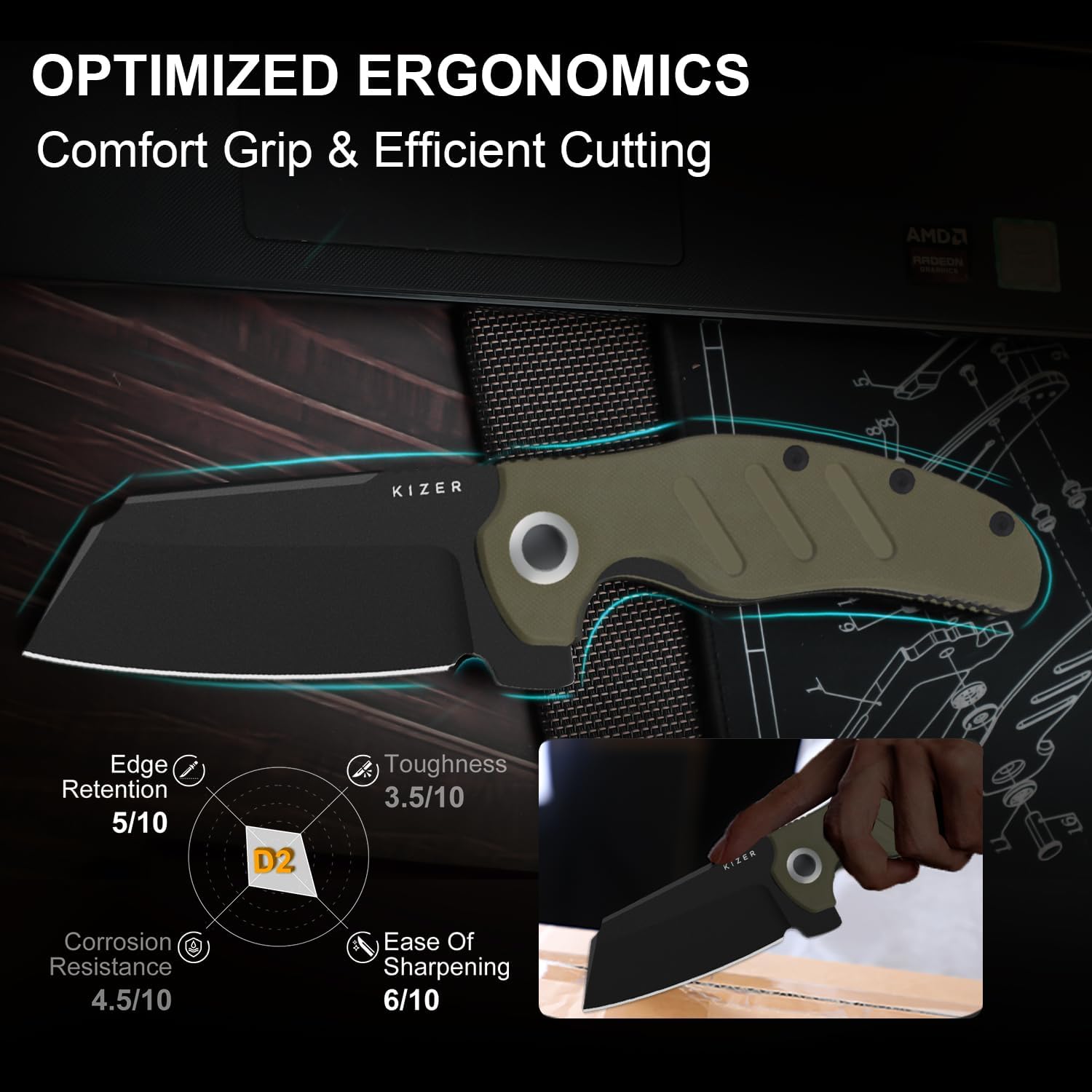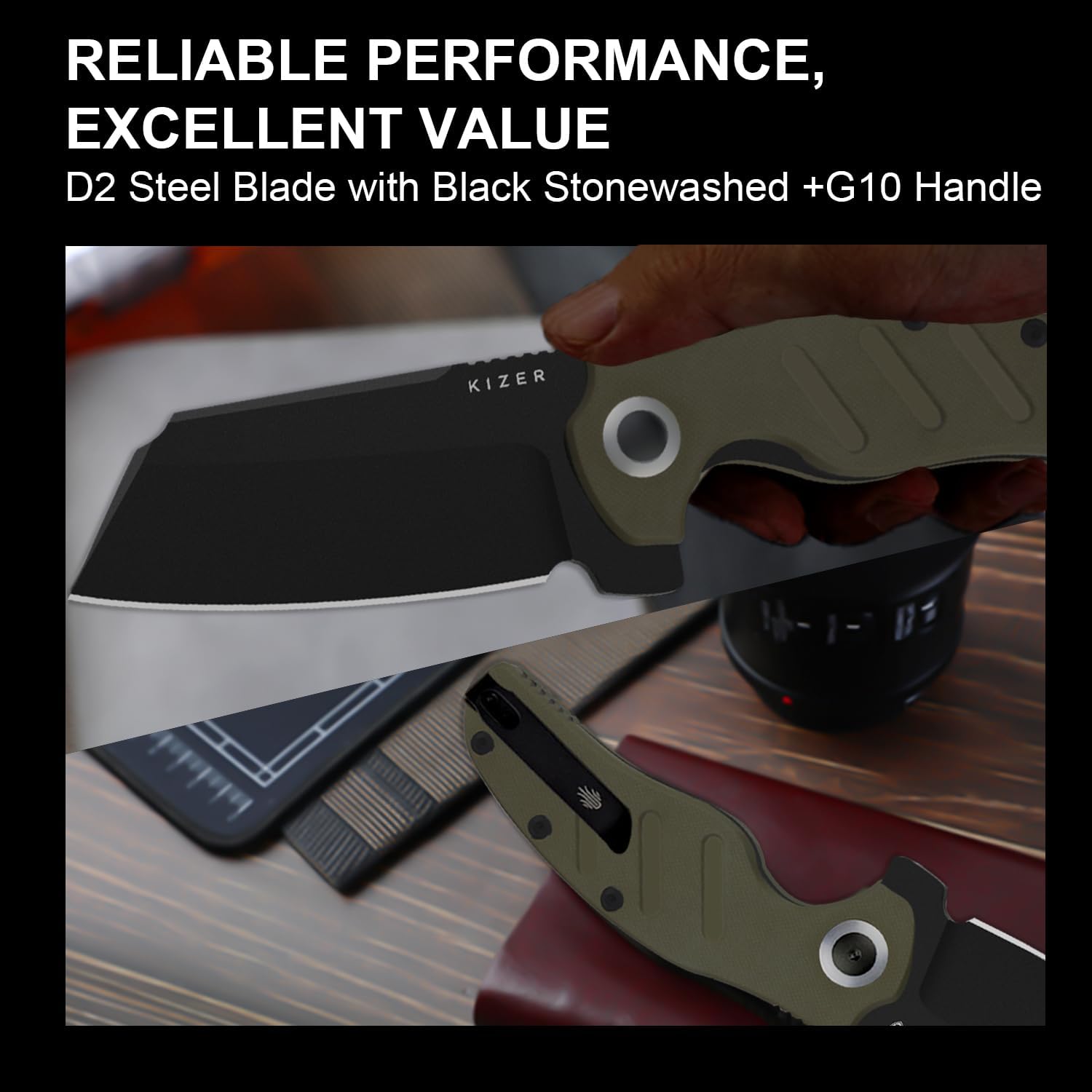 - Built to Perform, Made to Last: The Kizer C01C XL Sheepdog camping folding knife features a robust D2 steel blade with a wear-resistant black stonewashed finish that hides scratches for long-lasting use; The textured G10 handle ensures a secure, non-slip grip in all conditions; Designed for reliable daily performance, it offers exceptional durability and function in one compact tool