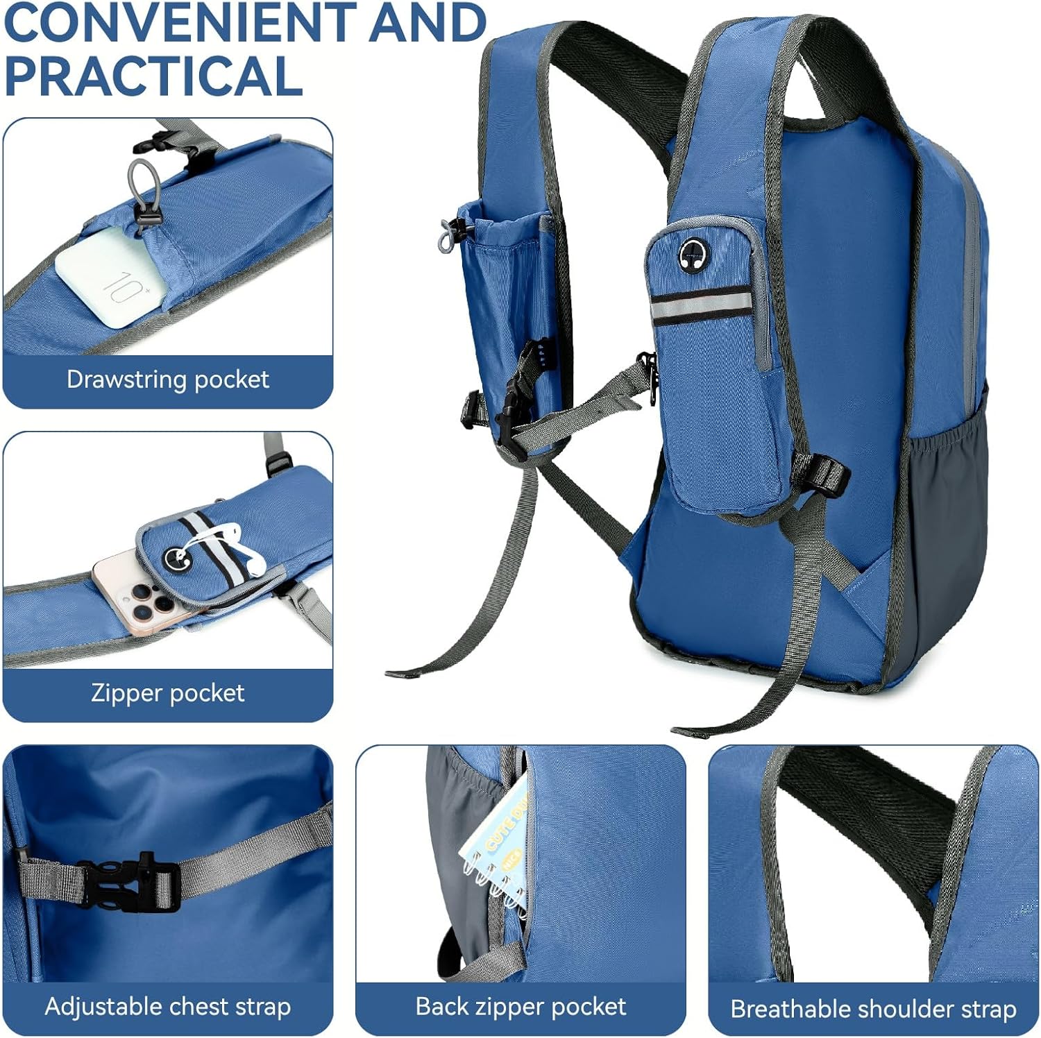 - Unique Shoulder Strap Design: The ergonomic shoulder straps feature a secure zippered pocket (fits phones up to 7”) and a drawstring pocket for quick access to essentials like keys, cards or snacks. Save yourself the hassle of taking off your backpack while hiking. Whether you're hiking, biking or traveling, these smart pockets keep your valuables safe and within reach.