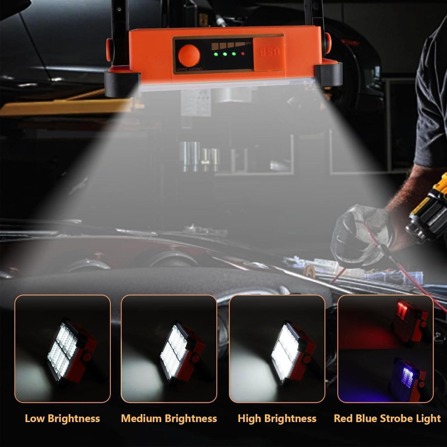 - Long Battery Time - Portable LED work light built-in 6000mAH rechargeable battery, only need to charge 4-5 hours to work at least 10 hours, 4 power indicator (100%-70%-50%-25%) easy to view the remaining power to ensure timely charging. Note: Please charge the work light before use, as it is in standby mode during transportation