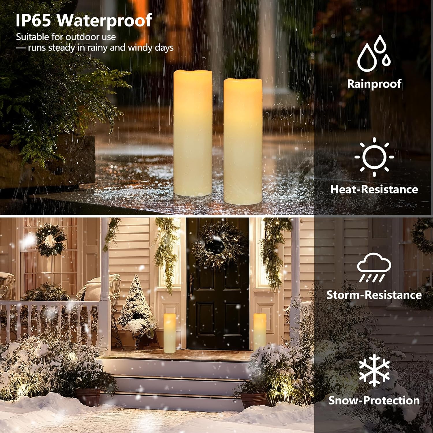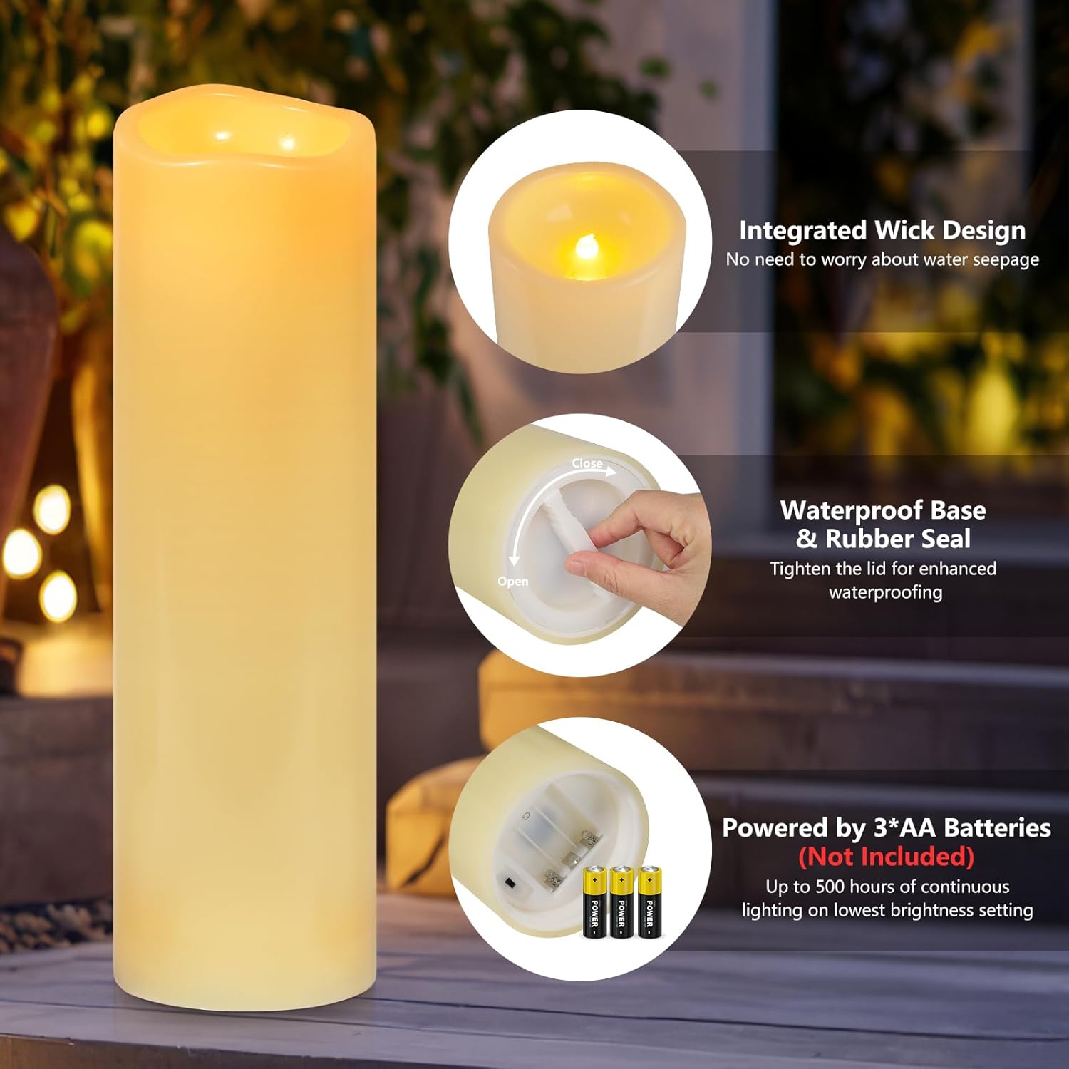 - Outdoor Waterproof Candles: Kimjo extra large candles made of thick, heavyweight plastic, windproof and heat-resistant, remains stable in rainy and snowy weather. The integrated wick and rubber seal ensure that this battery operated candles has good sealing and the waterproof grade reaches IP65. This ensures that these candles can be used outdoors for long periods without melting, warping, or letting water in