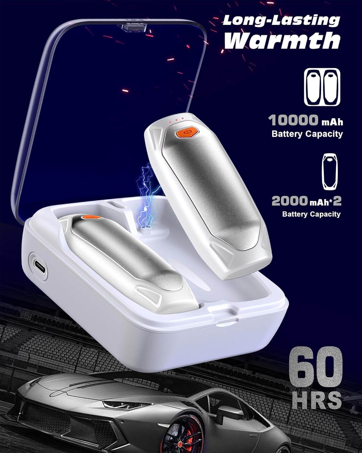- Innovative 14000mAh With Charging Case: Kesguar hand warmers rechargeable features dual 2000mAh hand warmers + a 10000mAh charging case innovative design.allowing you to quickly recharge your hand warmers on the go. Get 3 hours per warmer charge and up to 36-60 hours of continuous warmth, eliminating battery anxiety on outdoor activities like golfing, hiking, hunting, etc.