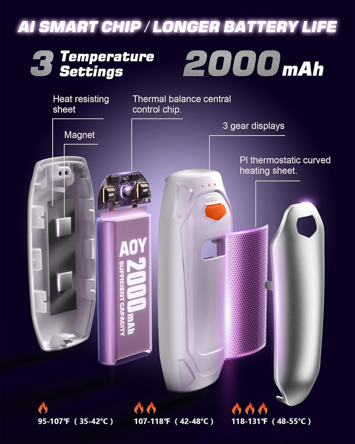 - 1s Instant Heat & 3 Heat Settings: Experience warmth in just 1 second with these 2-pack rechargeable hand warmer! Choose from 1st level (35℃/95℉-42℃/107.6℉), 2nd level (42℃/107.6℉-48℃/118.4℉), and 3rd level (48℃/118.4℉-55℃/131℉) banish the chill or soothe sore hands,keeping your hands cozy and comfortable.