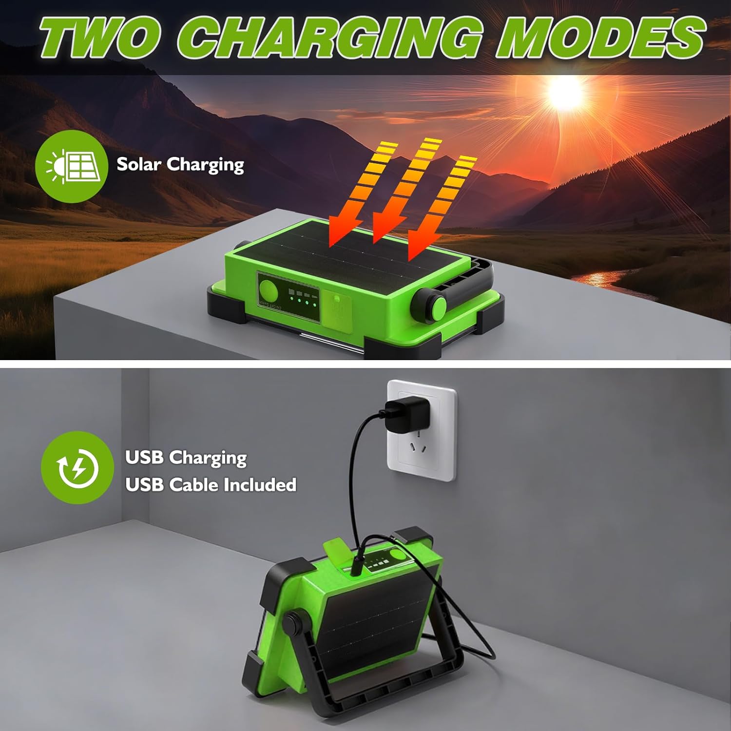 - 10000LM Super Brightness: Light up your workspace like never before! Our solar rechargeable work light delivers 10000LM of ultra-bright lighting, powered by 144 high-efficiency LED beads and a high-transparency glass panel for optimal brightness. Whether you're working in a dim garage, on a nighttime job site, or during a power outage, this lampara recargable cuts through darkness with ease