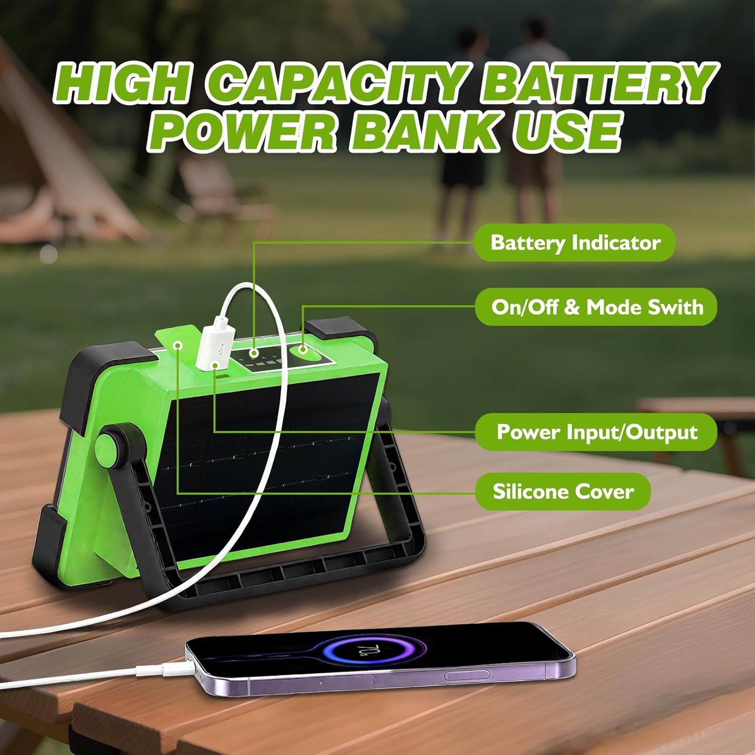 - Two Charging Ways & USB Power Output: Never run out of power when you need it most, And the 4-level power indicator (25%-50%-75%-100%) keeps you informed of remaining battery life. The 6,000mAh rechargeable battery charges fully in just 5-6 hours and lasts up to 12 hours on a single charge. Solar charging with 20% energy conversion efficiency - ideal for off-grid use. USB power bank function (5V/2A output) to charge phones, tools, or other devices in emergencies