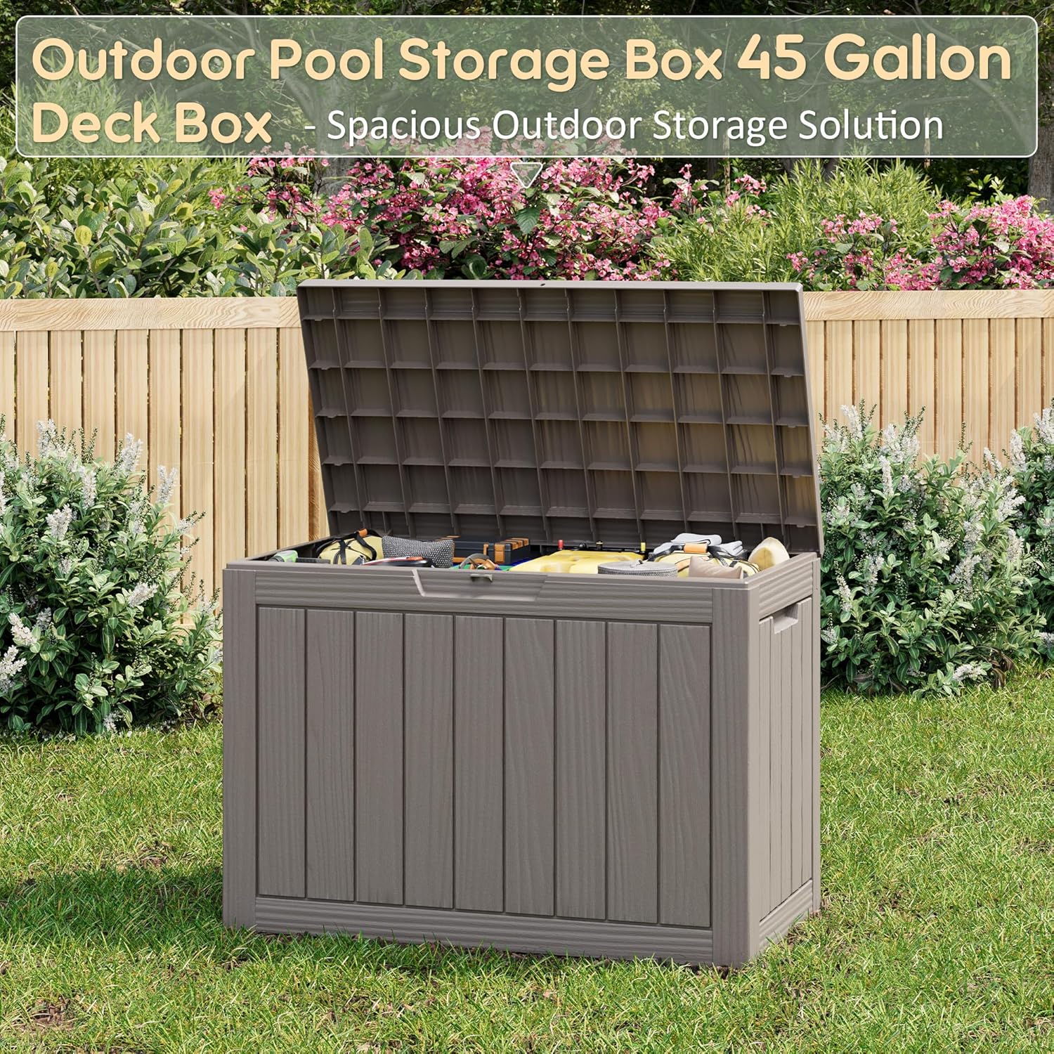 - đŚă45-Gallon Large CapacityăApprox. 30.3" x 16.7" x 21.7" spacious interior easily stores garden tools, pool accessories, cushions, and other outdoor essentialsâkeeping everything tidy at a glance.